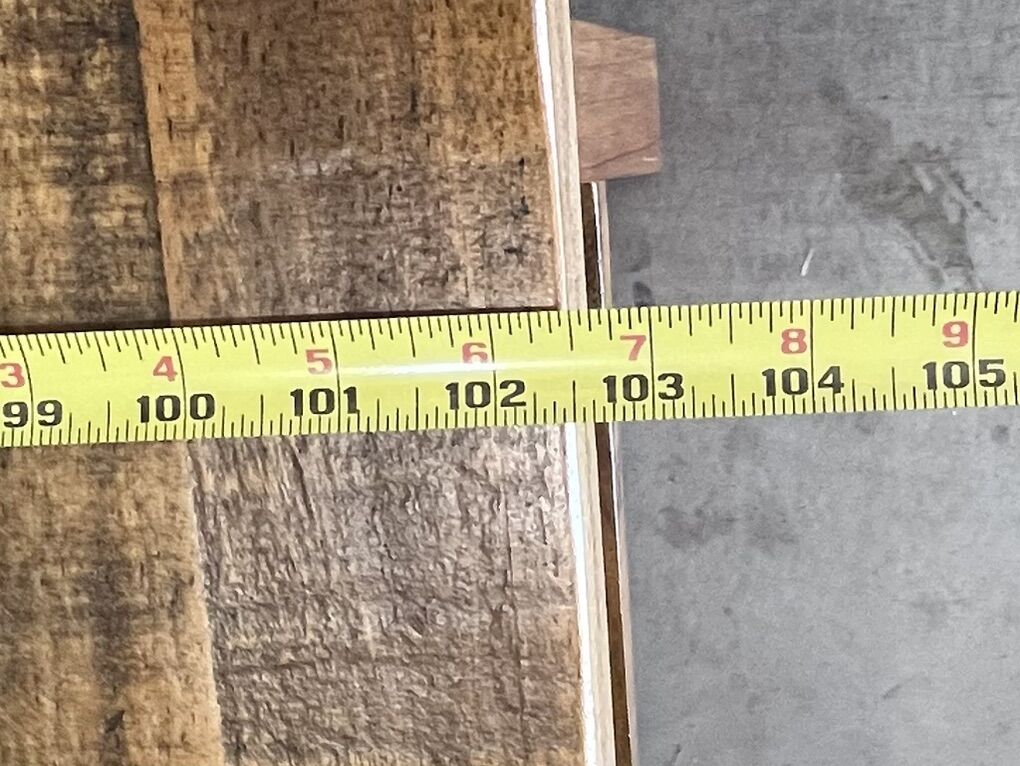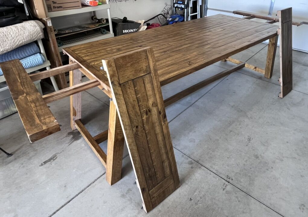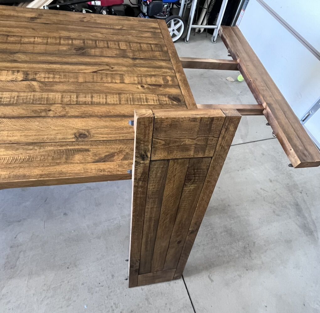 Large solid wood dining table with 2 - 12 inch leafs. Measurements are - Length- 102 inches ( without the 2 12 inch leafs) Width - 42 inches Height- 31 inches • There are NO chairs