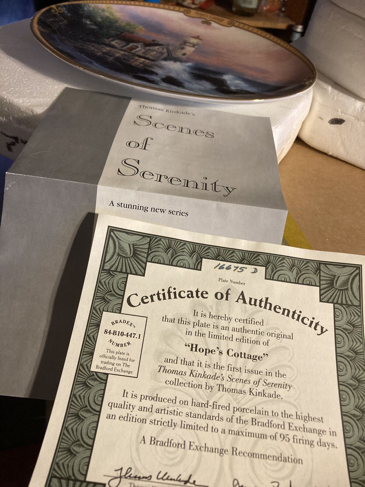 ZelleThis is plate number 16675 D of a limited edition of Thomas Kinkade's "Hope's Cottage" as re-created on fine porcelain. "Hope's Cottage" is the first issue in Thomas Kinkade's Scenes of Serenity plate collection.