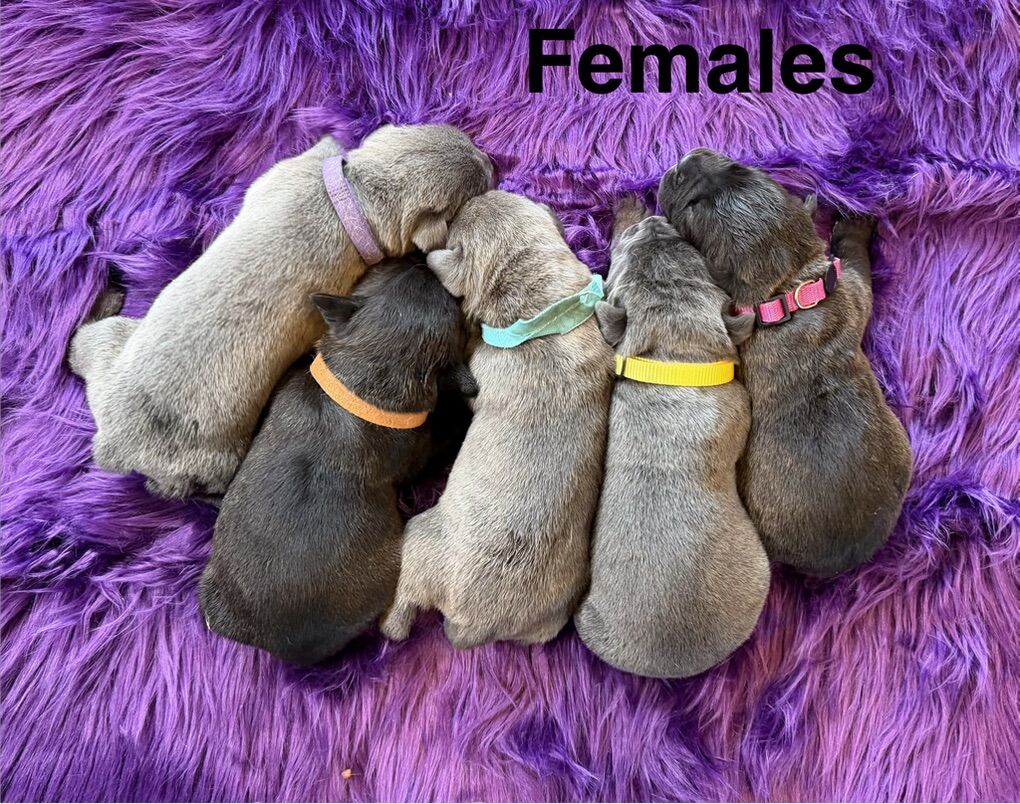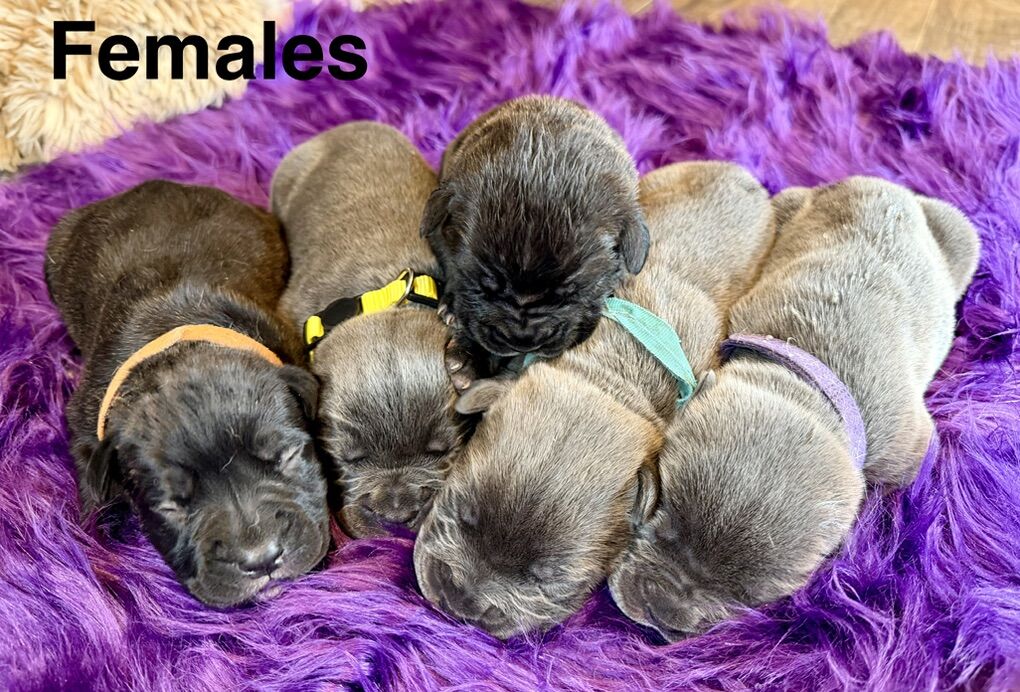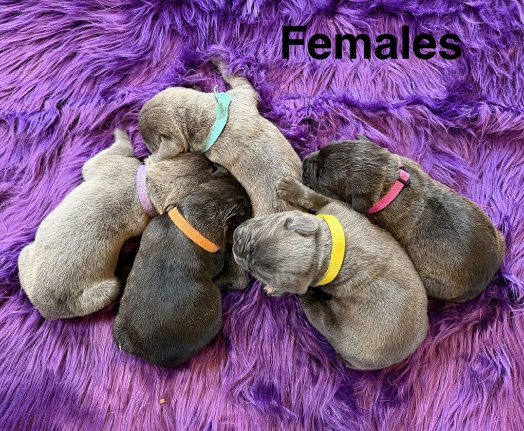 5 Females Pink Collar- Black Brindle Female Orange Collar- Black Brindle Female Yellow Collar- Big Blue Female Purple Collar- Blue Female Turquoise Collar -Blue Female