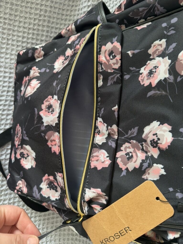 VenmoSuper cute brand new with tags Kroser floral backpack! Is a large/regular sized backpack with one steel reinforced main zippered pocket and a smaller outer zippered pocket. Features a USB connecting cable inside for easy charging, two padded pockets for laptops or tablets, and multiple other smaller pockets. Features gold colored zippers and black leather carrying handles for added convenience and style. Poly canvas material is durable and water repellent, and edges are reinforced. Would make a great college or student backpack, or gift for anyone who is on the go a lot! Measures about 17 inches tall, 12 inches wide, and 7 inches deep. Located in Layton