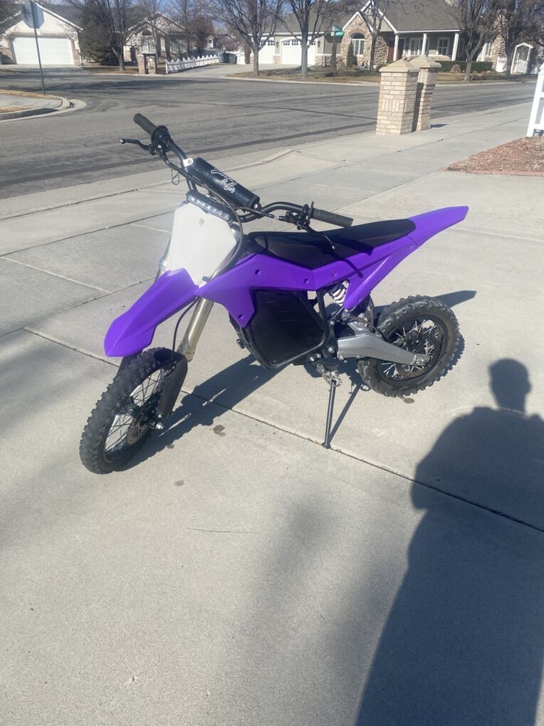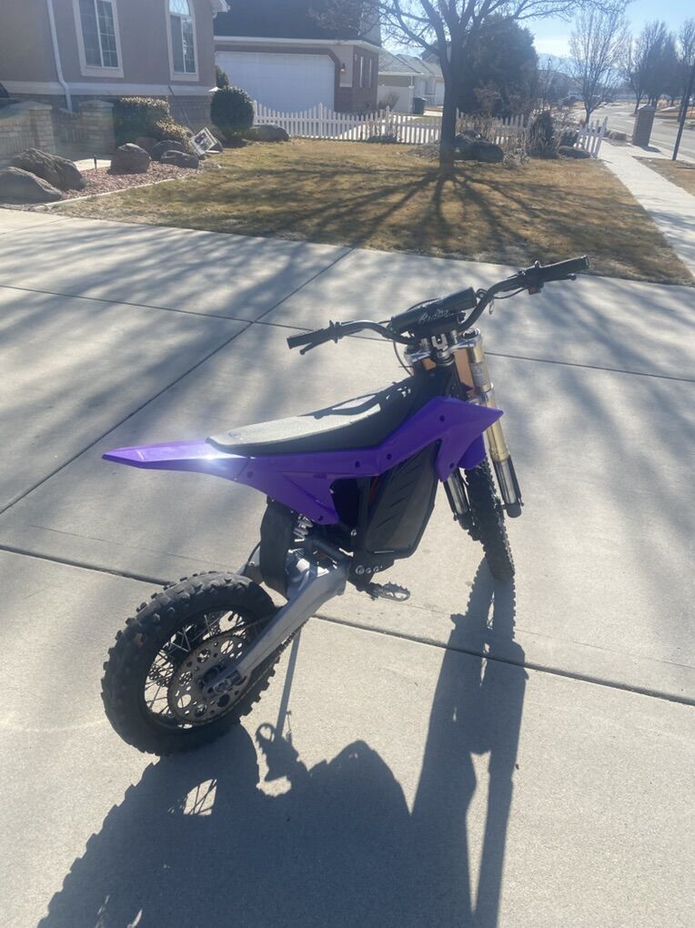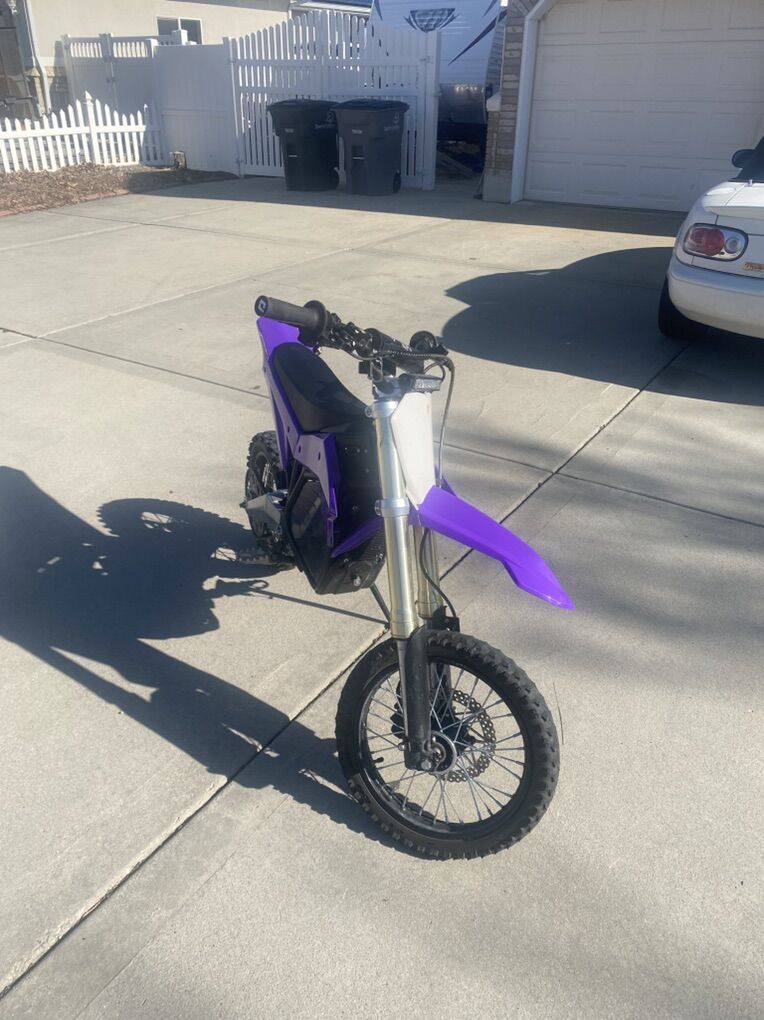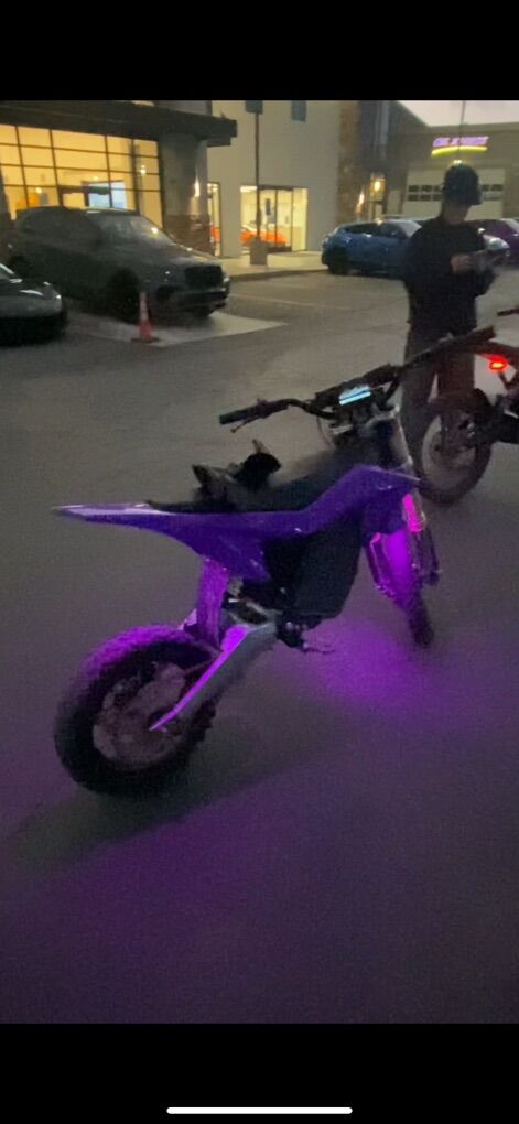 This is my modded ETM RTR. it is a great bike and is super fun but my mom is making me sell it to buy a car. It’s got an upgraded high torque motor which allows it to pop up the front wheel extremely easily for wheelies, ultra light sprocket and high performance chan, purple plastics and red plastics, odi grips, underglow, and rechargeable headlight for riding at night. super fun bike and I’m sad it has to go. It’s 8000 watt high rpm motor and 72 volt 25 amp hour battery for a high speed of 57 miles per hour. I’ve taken it to the desert and the battery lasts for about 4 hours. It has a couple hundred miles on it but the odometer got un-programmed somehow so it only displays 80 miles. overall, this is a great bikes and super powerful and easy to wheelie and it goes very fast. $3700 OBO shoot an offer (no trades) cash is preferred.