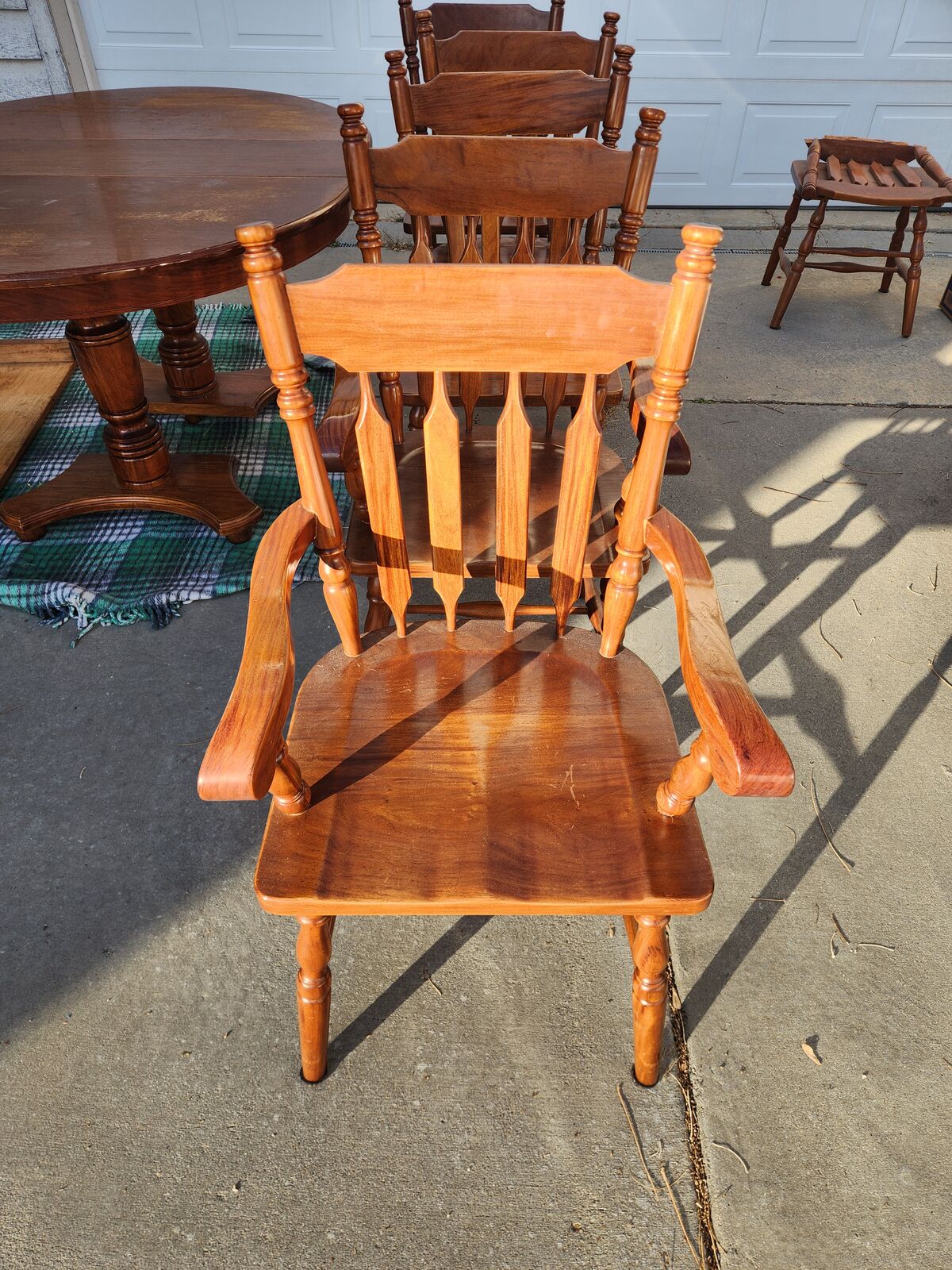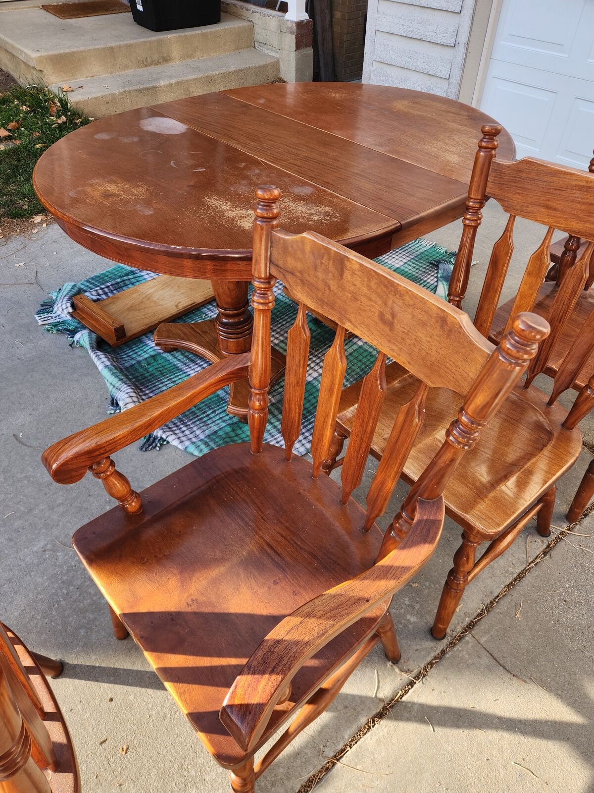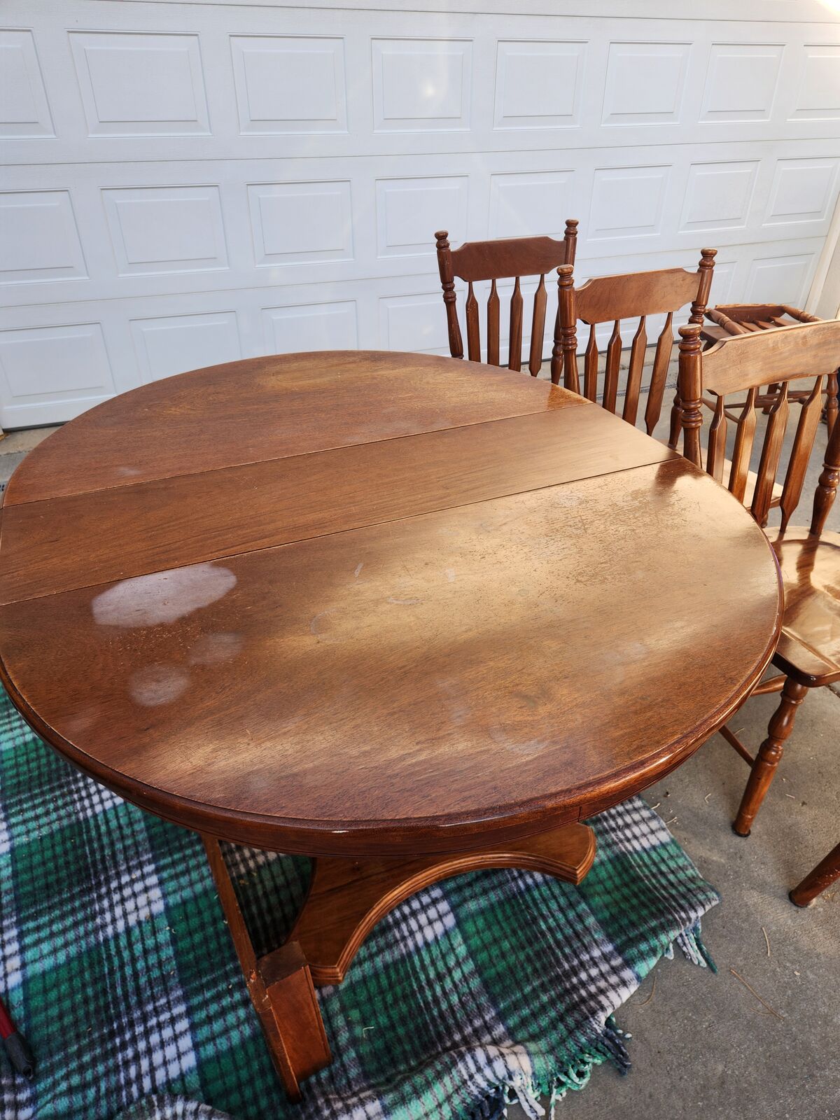 VenmoHandmade solid Philippine hardwood dining table with two expansion leaves. Includes five chairs. A sixth chair is damaged but could be repaired. Table shows some surface discoloration. Sturdy, well-built set with plenty of life left and great potential for refinishing or restoration.