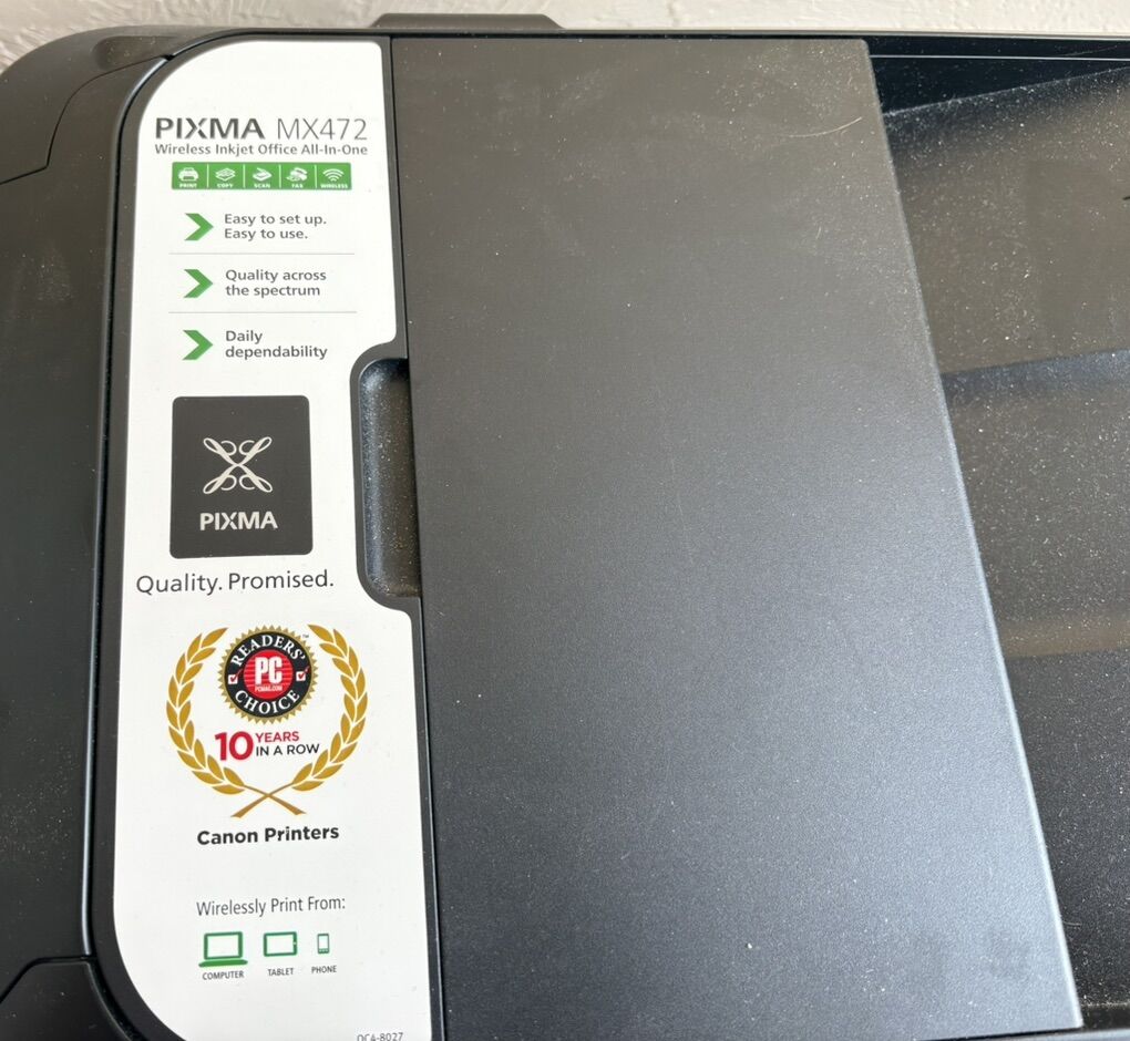 Canon Pixma MX472 printer, used, in good condition. It is wireless, scans, copies, and has fax capability from a landline. Has been used as recently as January and works great. Selling with whatever ink is left in the cartridges.