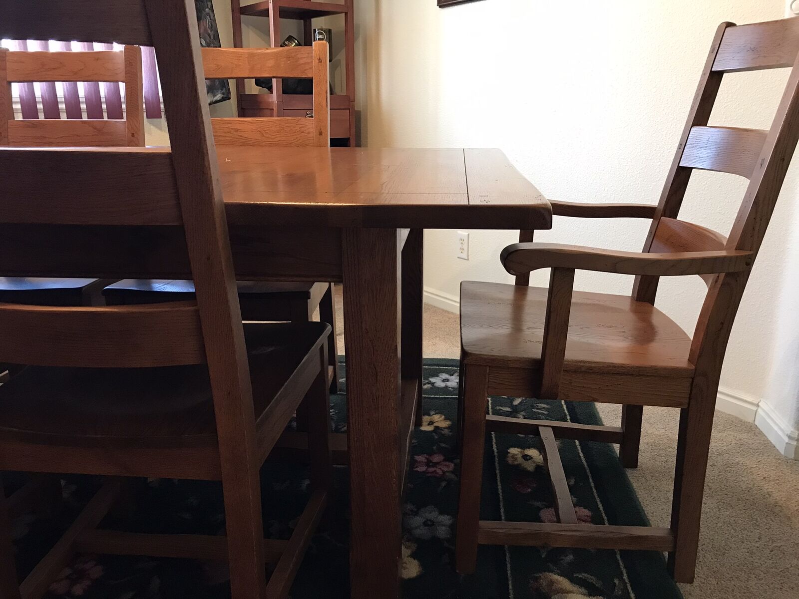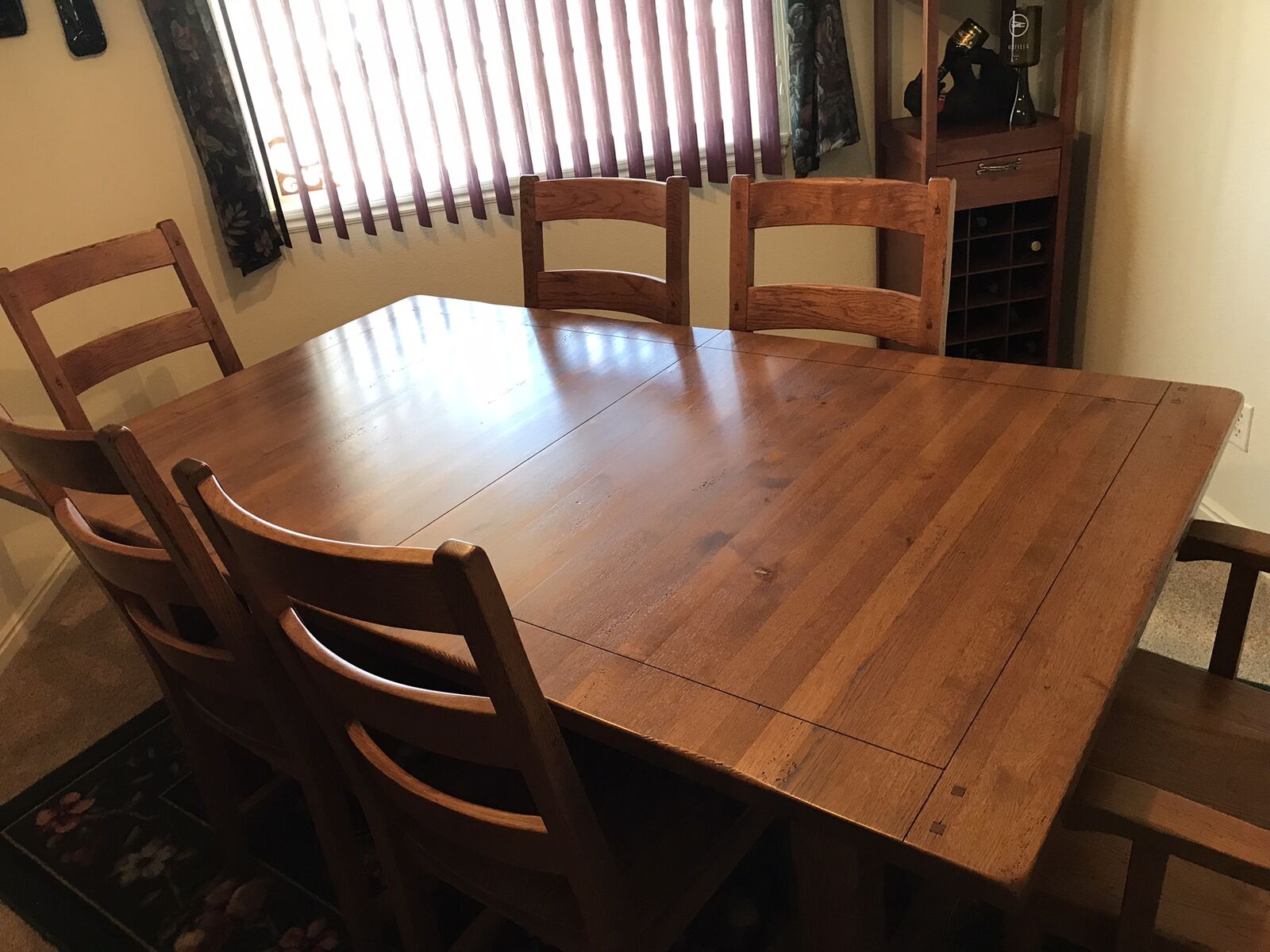 Rustic solid oak dining table with self storing leaves, 42"x6'. Leaves are 16"x42" each. Four chairs and two captain chairs.