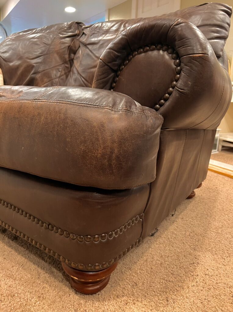 This is a rustic style dark leather loveseat couch in good condition. It’s perfect for a cabin, or a basement home theater room.