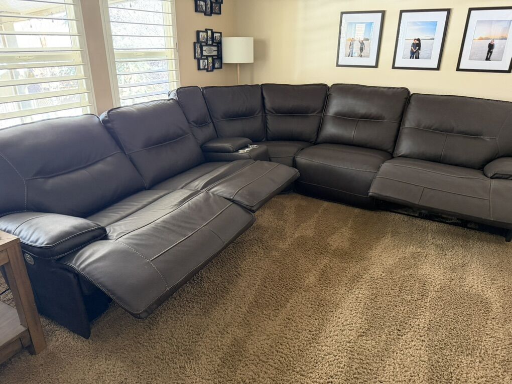Brown, polyurethane leather sectional with 3 recliners - 2 auto, 1 manual. This sectional is in amazing, like new condition (only about 2 yrs old). Perfect for a big family and will create a cozy vibe for your family room. $1500 OBO.