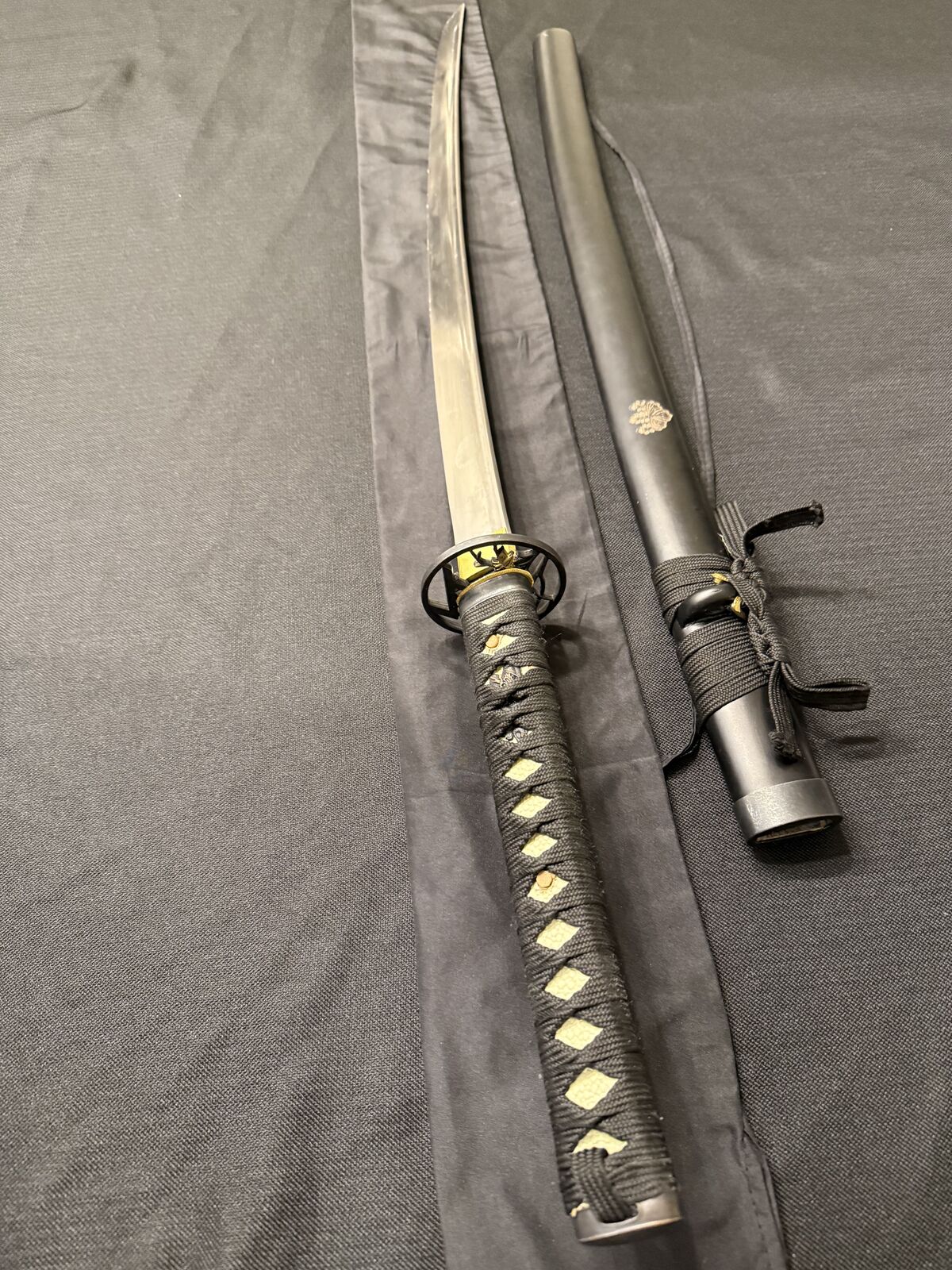 Katana is Musha Gakuto Katana. Length 39". Blade length is 28". made from high carbon steel. Has a few small knicks in blade.