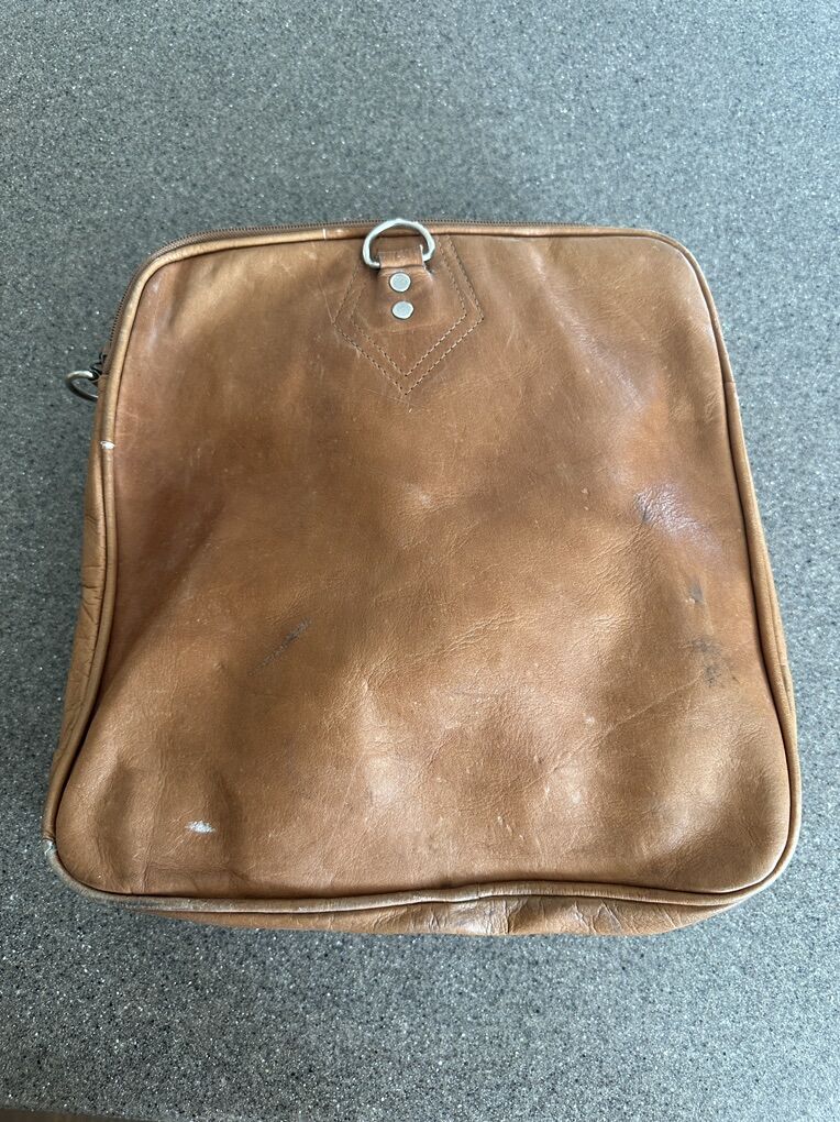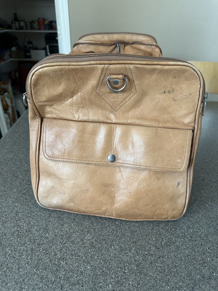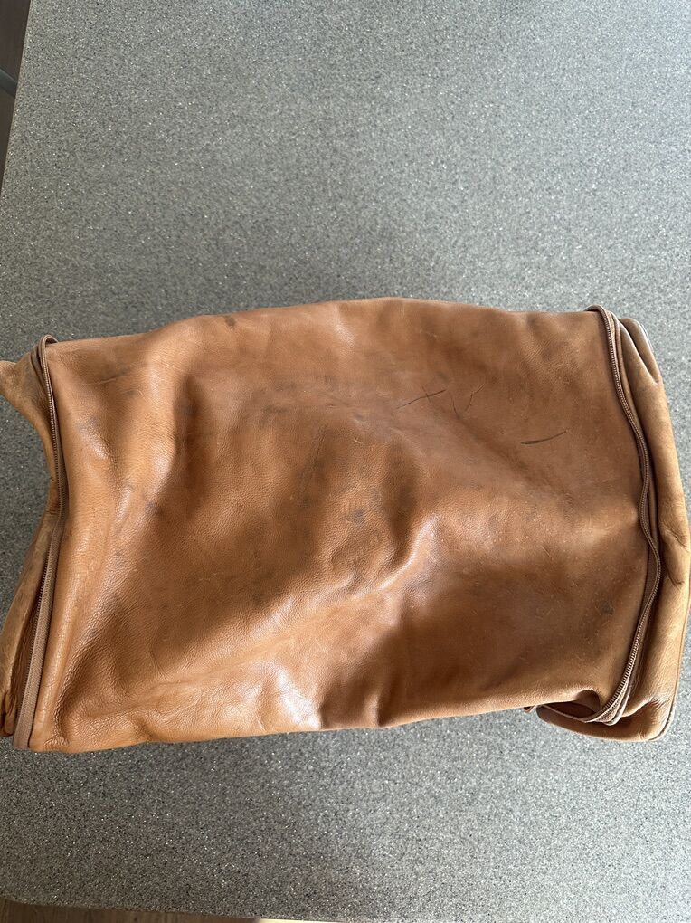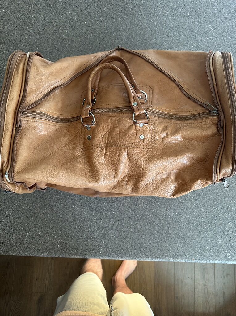 VenmoThis leather duffle bag is real leather, not parts is parts. Dimensions unzipped are 20”x11”x11”. Zipped up is approximately 11”x12”x4”. Large main compartment plus convenient side zipper pockets are great for additional storage out if you want to use it zipped up as a purse. Also has an additional snap enclosed pocket on one end. You can fit a lot in this bag.