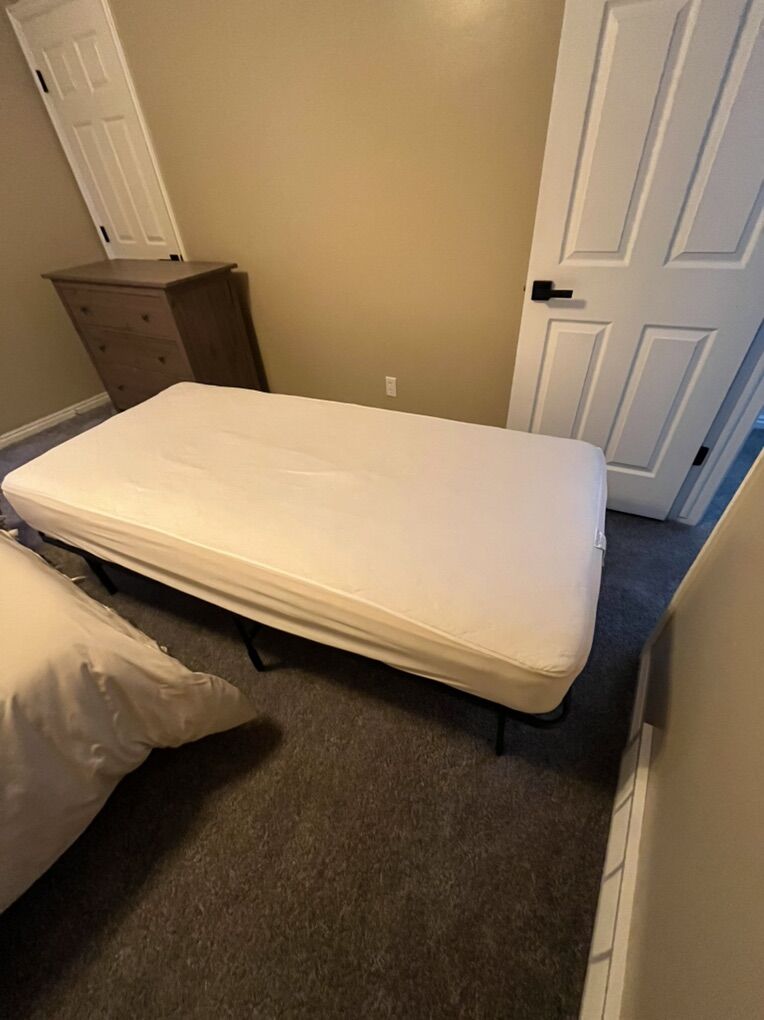 Black metal frame easy to set up no tools needed Easy to transport folds up real small Comes with mattress