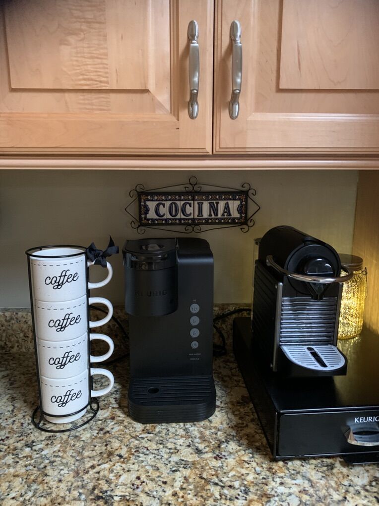 VenmoWhether you have espresso or coffee these mugs are a great fit. They feature a speckled white glaze and the word coffee in a black script. Cups are 5 1/2”W x 3 1/2”T. Drink opening is 3 1/2” and a 14oz capacity. Stand is 12”H x 6”W (w/cups). Clean and ready to go.