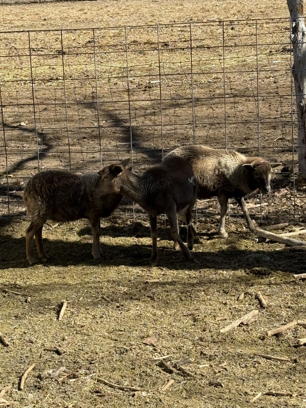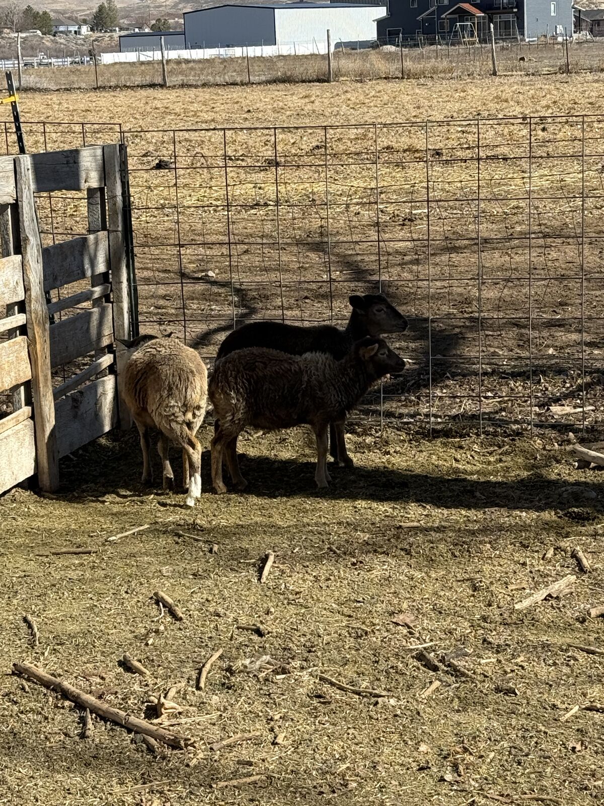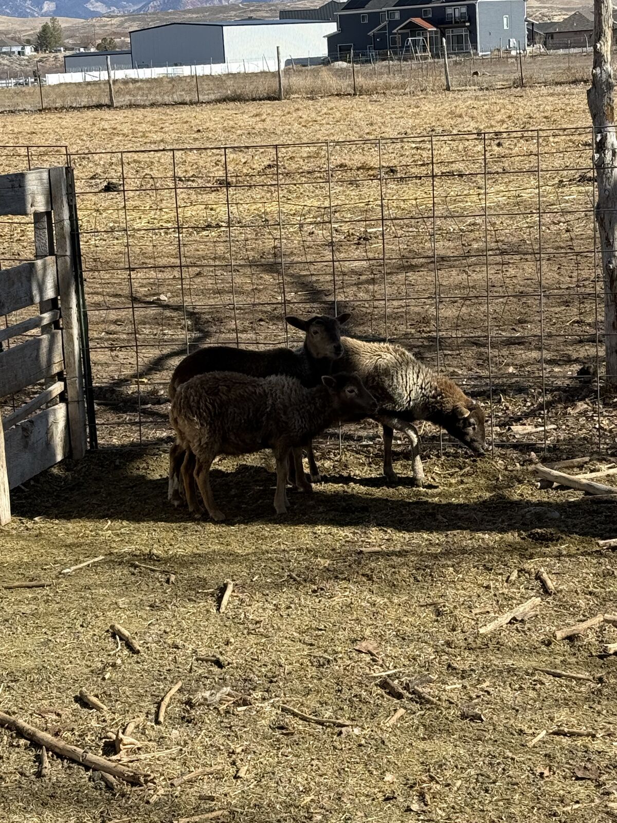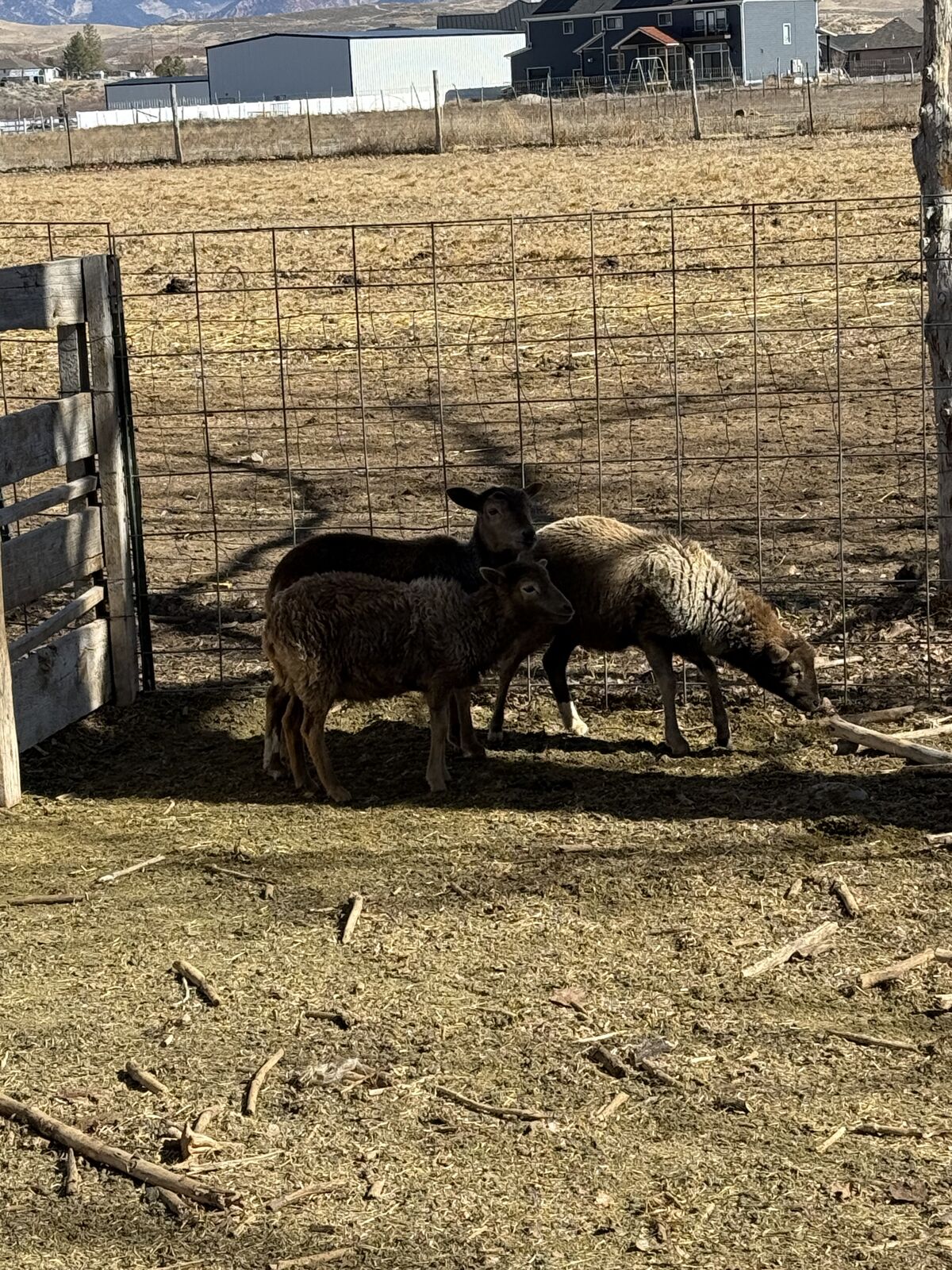 3 young lambs for sale — healthy, strong, and eating hay well. Weights range from 50–60 lbs.