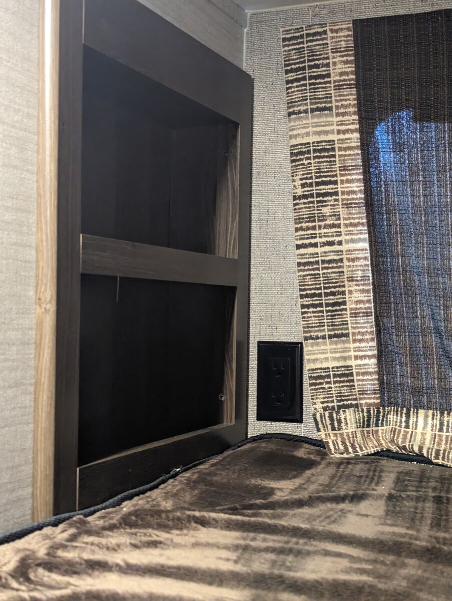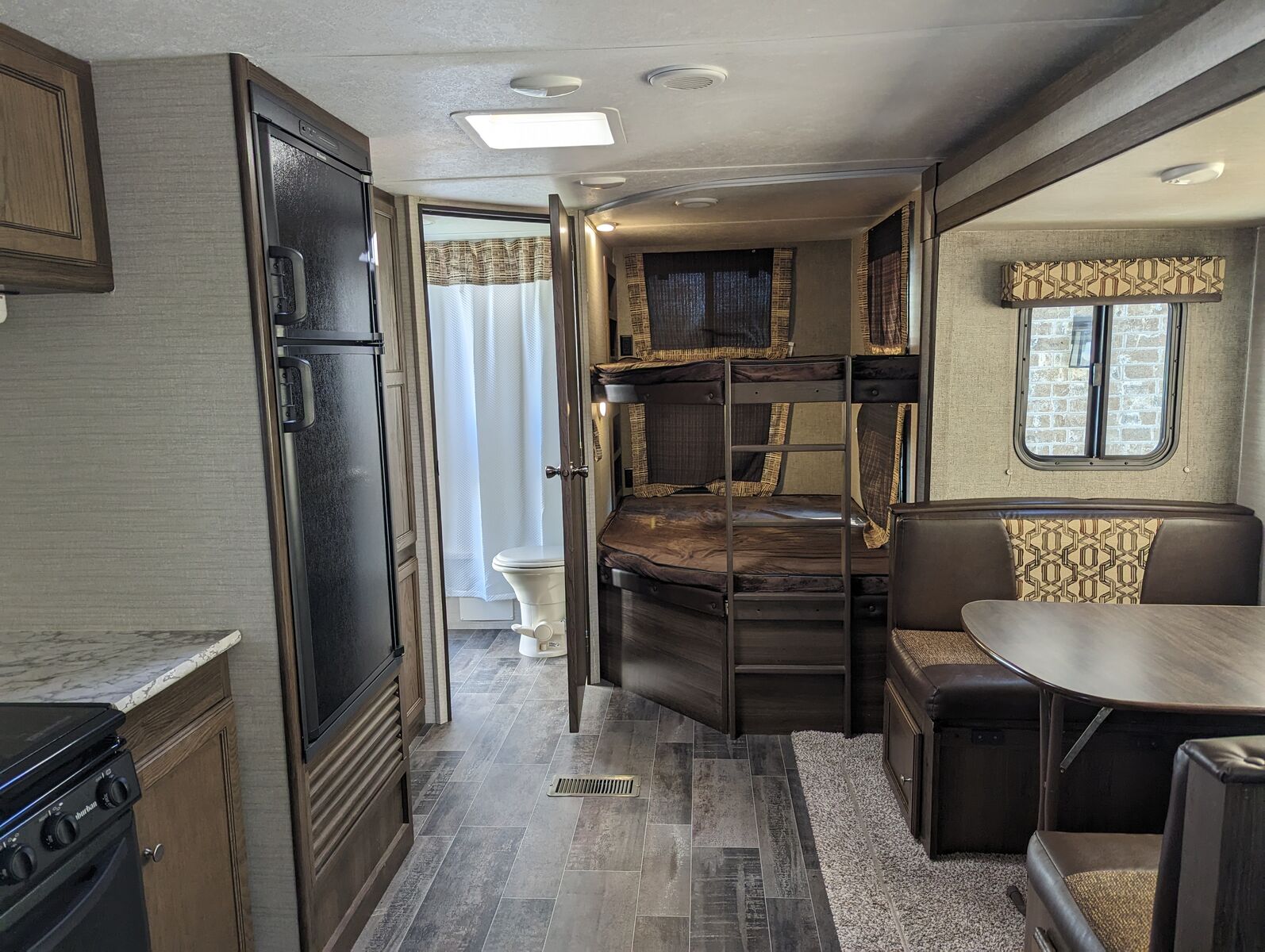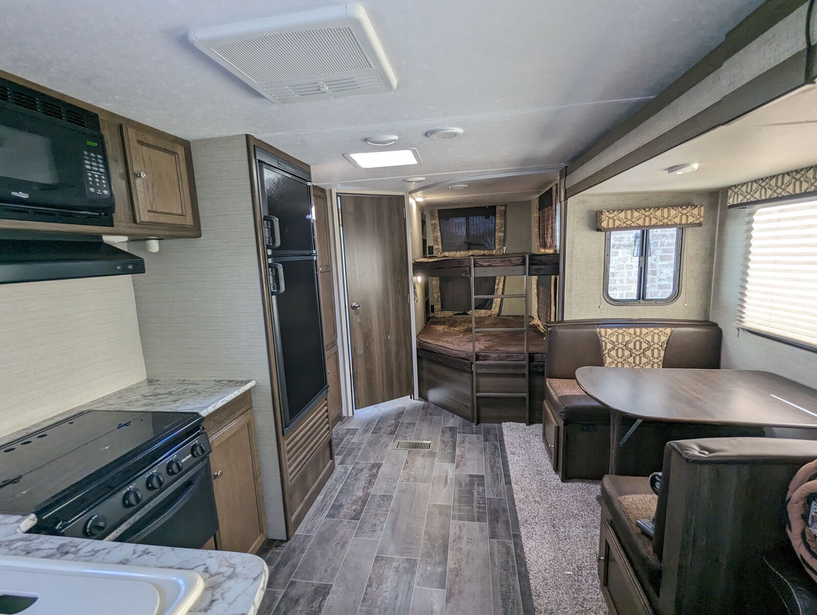 Some of the features are: Front queen size bedroom has dual wardrobes and overhead cabinets. Kitchen is equipped with deep sink, three burner range, oven, microwave, huge pantry. Living room features a sofa with overhead cabinets, as well a large dinette. In the rear you’ll find two full sized bunks, large bath with a shower, toilet, vanity, and medicine cabinet. Second door access makes it easy to access bunk area and bathroom.