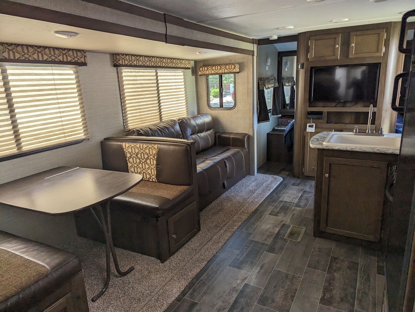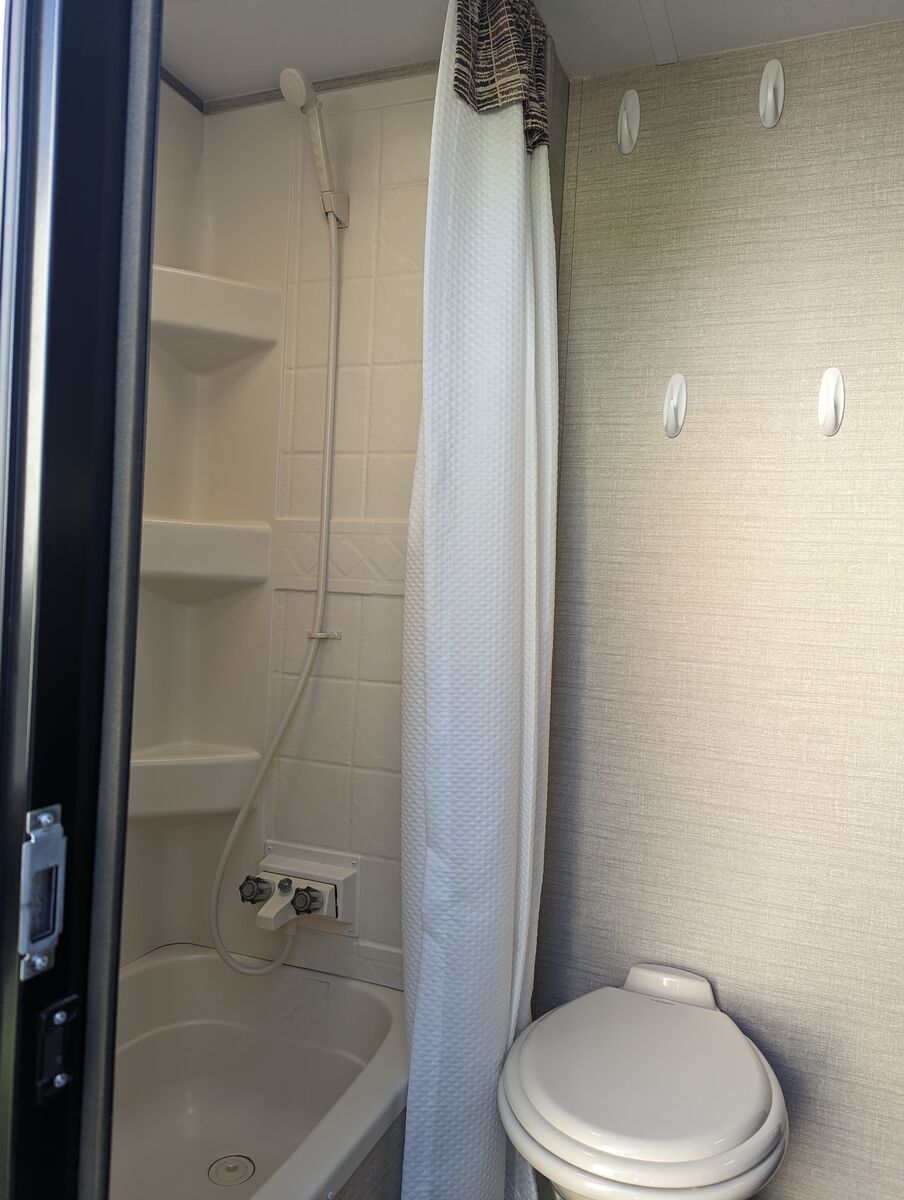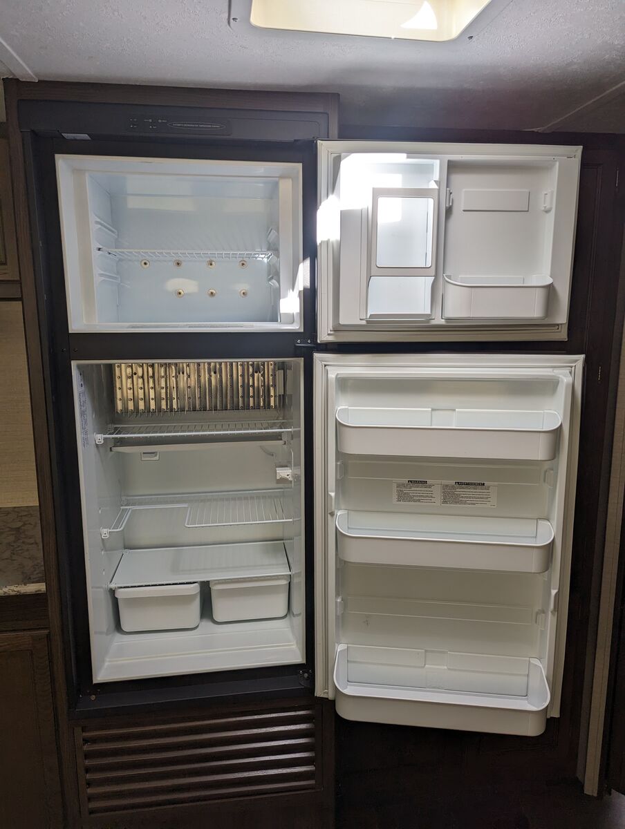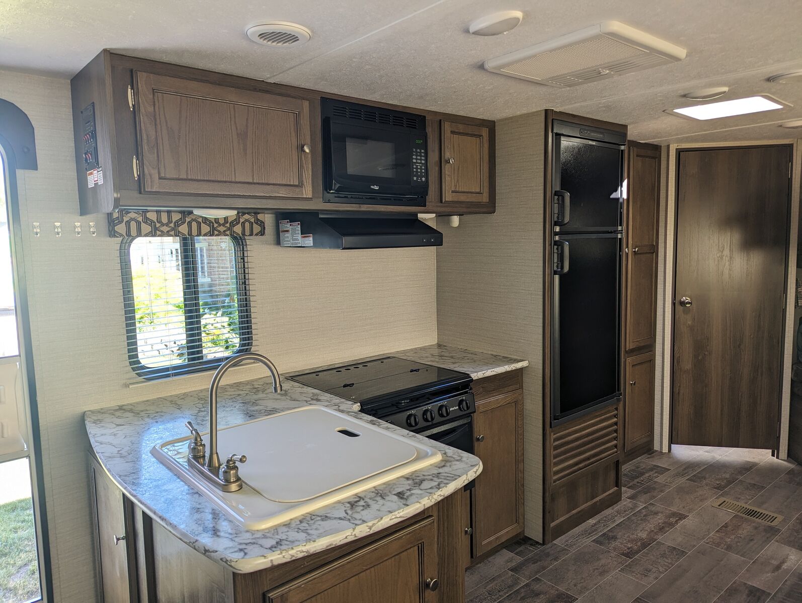 Some of the features are: Front queen size bedroom has dual wardrobes and overhead cabinets. Kitchen is equipped with deep sink, three burner range, oven, microwave, huge pantry. Living room features a sofa with overhead cabinets, as well a large dinette. In the rear you’ll find two full sized bunks, large bath with a shower, toilet, vanity, and medicine cabinet. Second door access makes it easy to access bunk area and bathroom.