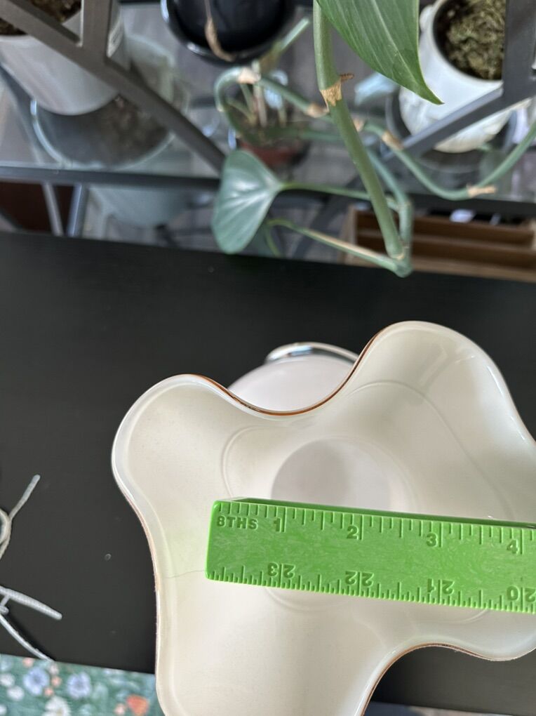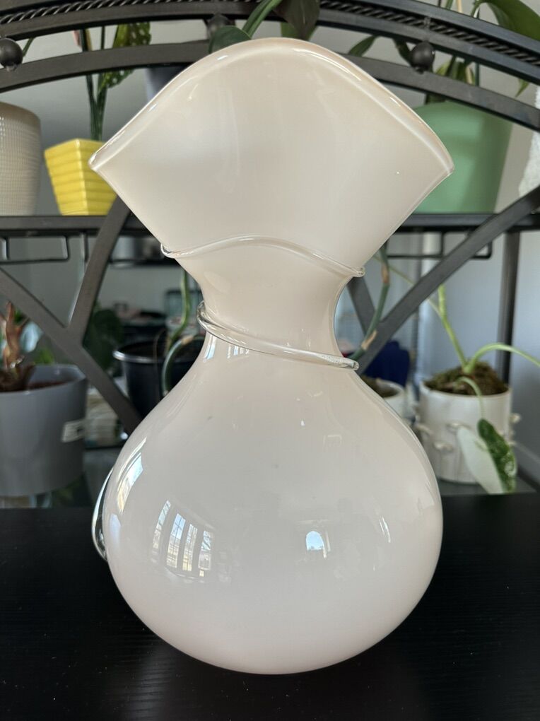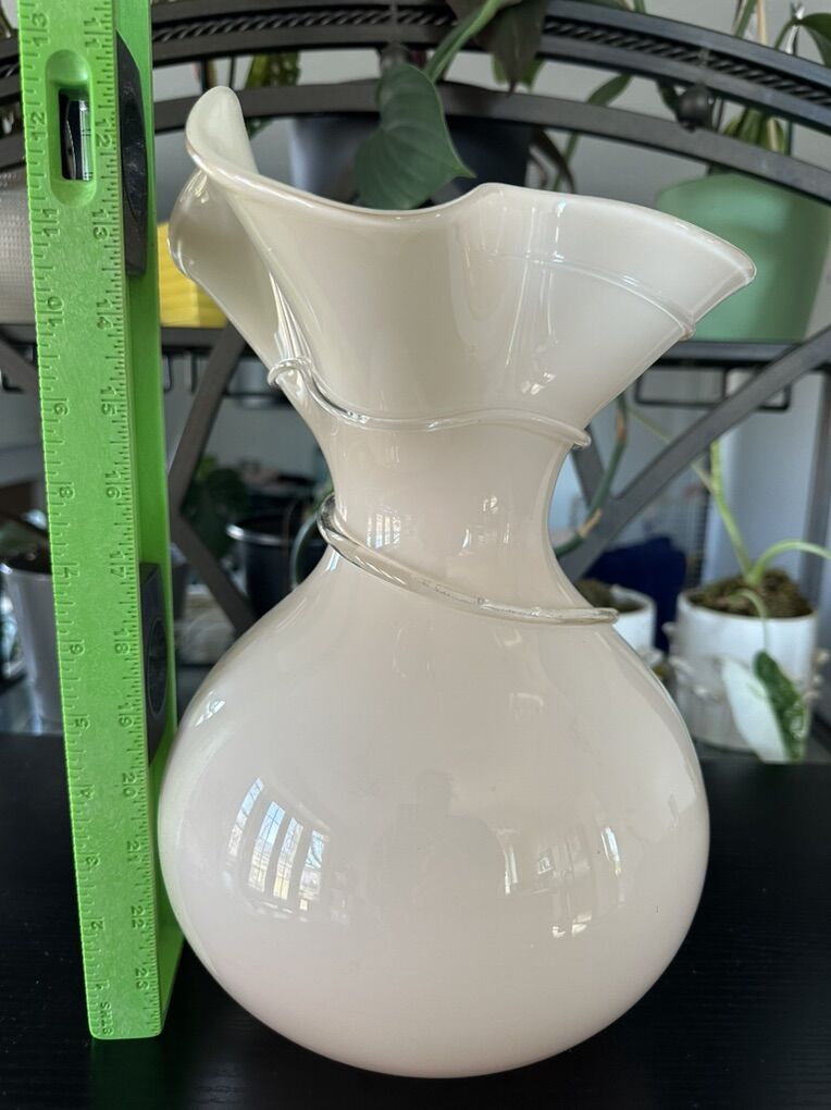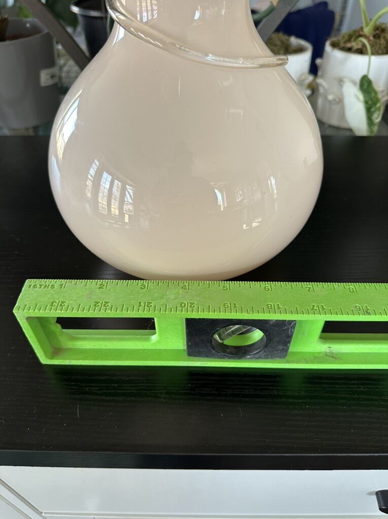 VenmoMy mom bought this in a Colorado flower shop 22 years ago. It’s clean with no water marks. The only time it had water and flowers was when my mom got it. It is glass. About 13” at its highest point and about 8” diameter. The smallest part of the opening is about 2.5” wide, the top opening is about 8” wide.