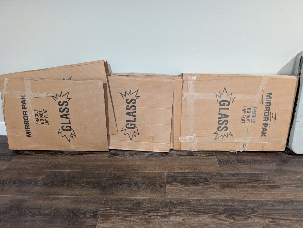 Glass is still in the packing material from when we moved. We've mounted our TVs on the wall so there's no need for a TV stand. There are a few nicks in the wood but overall it's a good TV stand.