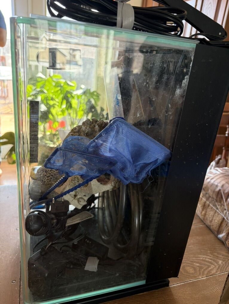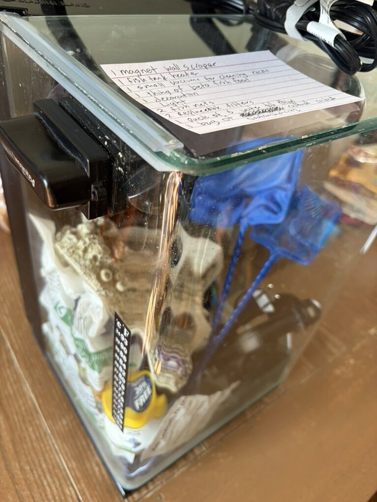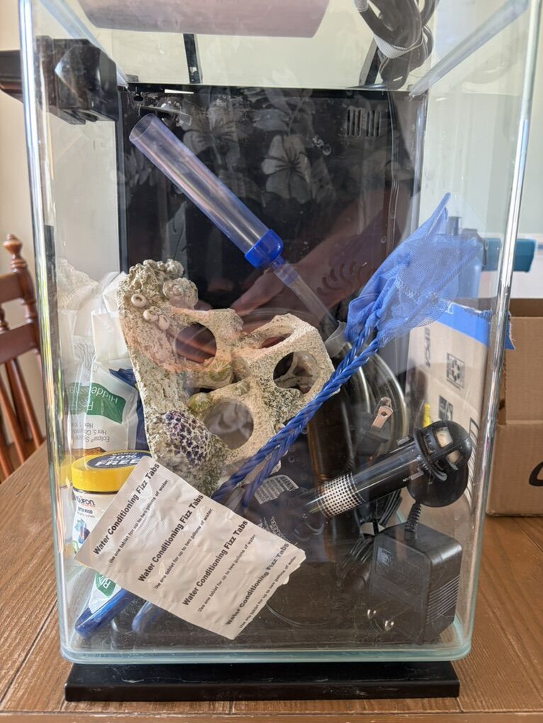 VenmoThis is a fully functioning tank, it is 5 gallons, and contains: 1magnet wall scraper 1 vacuum rock cleaning thing 1 beta food (used but full) 1 decoration 1light 2fish nets 2 replaceable filters 1 pack of 6 water tablets 1 big bag of colored rocks (doofenshmirtz themed)