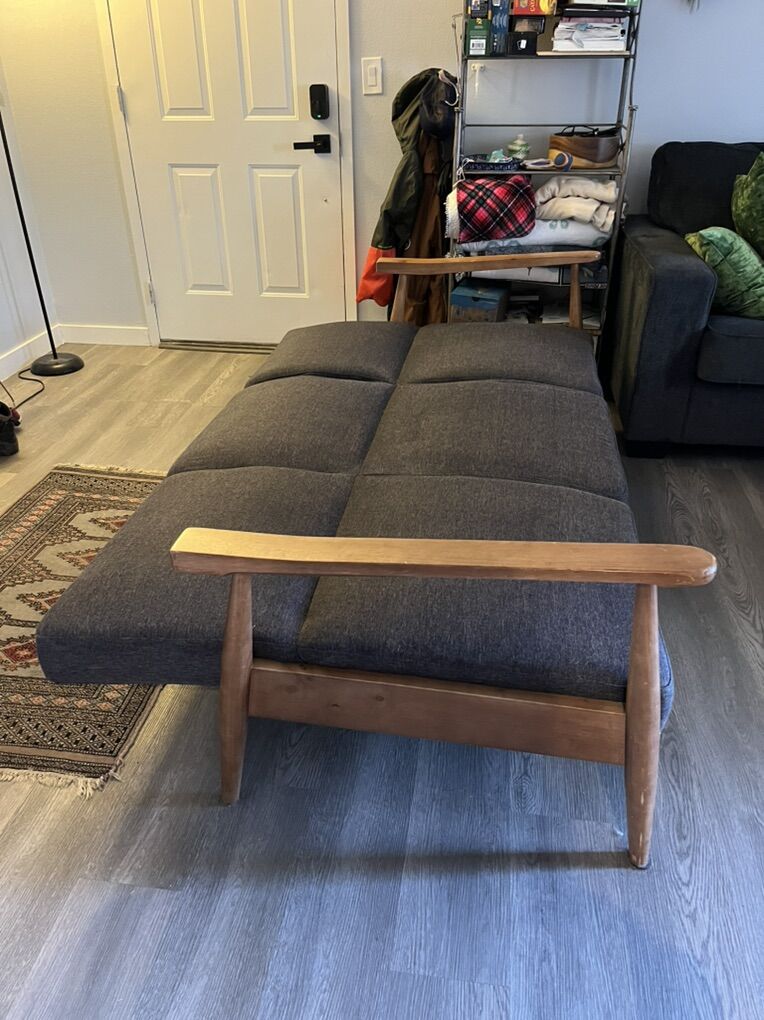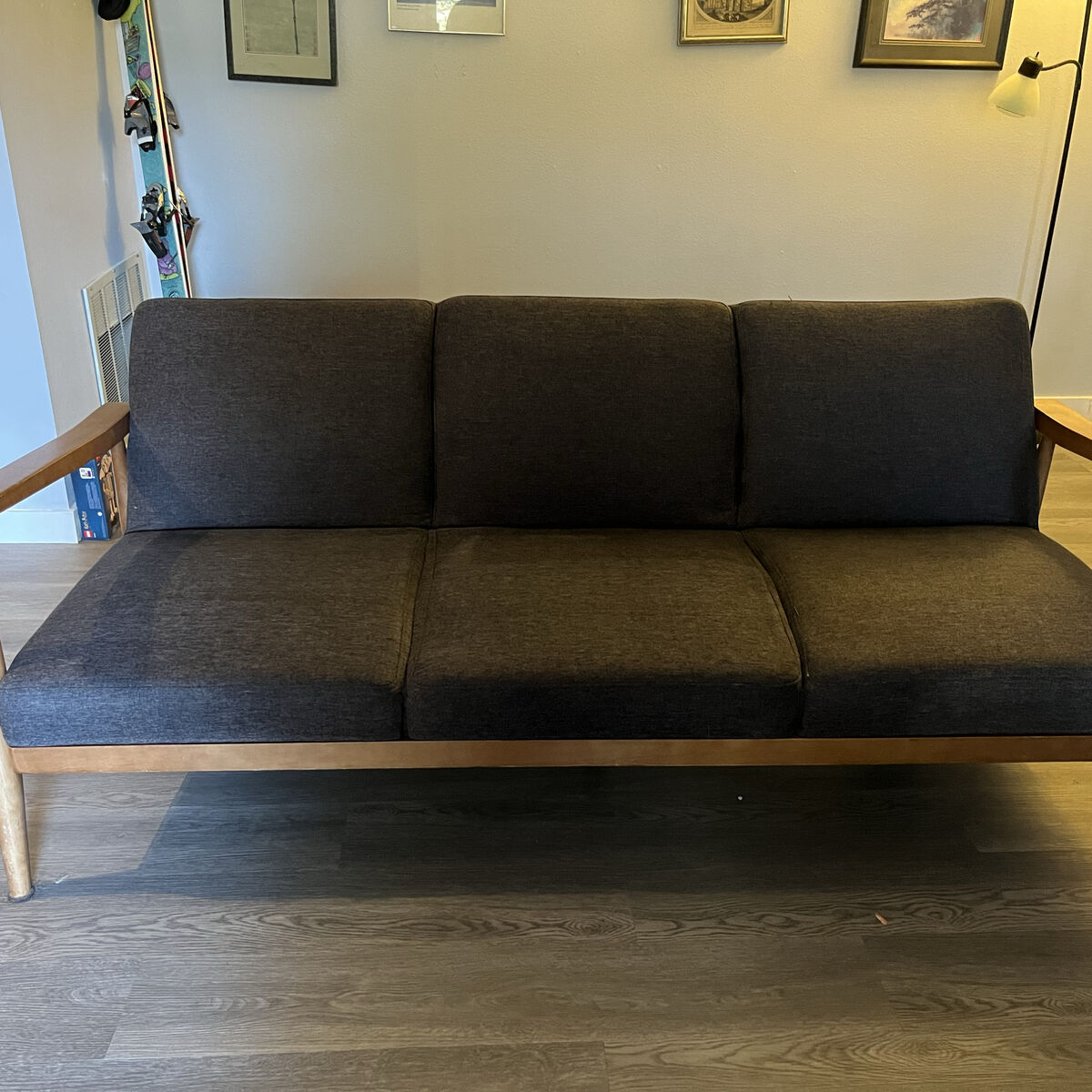 VenmoMid century modern style couch, folds down into a futon Measures 76in long x 32 in deep Futon 72in x 43 in