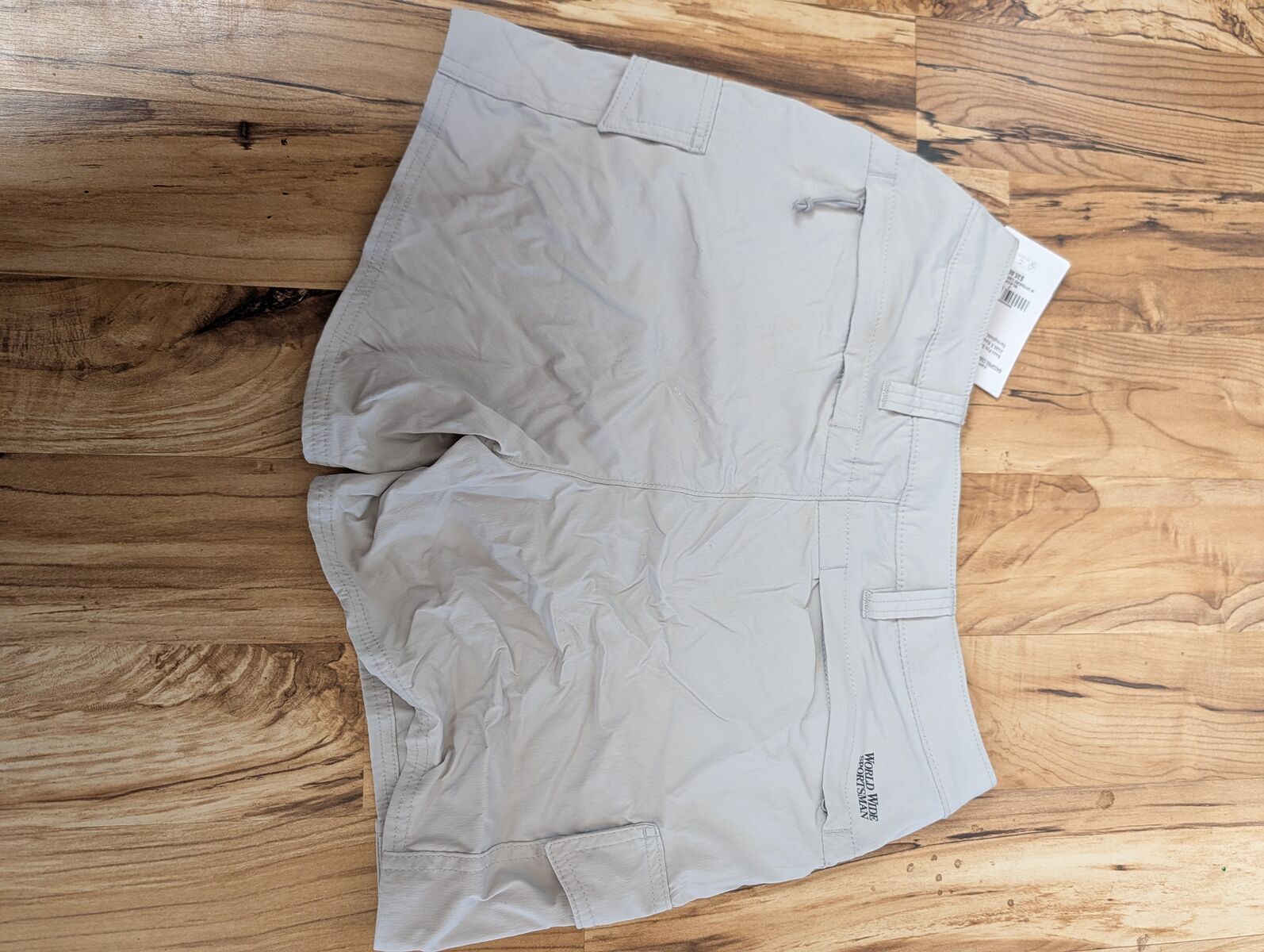 Full day of boating on your schedule? Play in comfort wearing our World Wide Sportsman Offshore Cargo Shorts for Ladies. Made from 96% nylon/4% spandex, these shorts provide top performance and a comfortable, easy-moving fit. UPF 50 sun protection tech safeguards your skin from harmful UV rays, and the quick-drying fabric resists water. And if the shorts do get wet, the flexible fabric spreads moisture out for faster drying. These women's fishing shorts are outfitted with 2 hand pockets, 2 zip back pockets for secure storage, and 2 cargo pockets for extra storage. Inseam: 5". Machine wash. There is a small stain that may come out with wash. Possible tape residue. Price has been dropped dramatically to accomodate this.