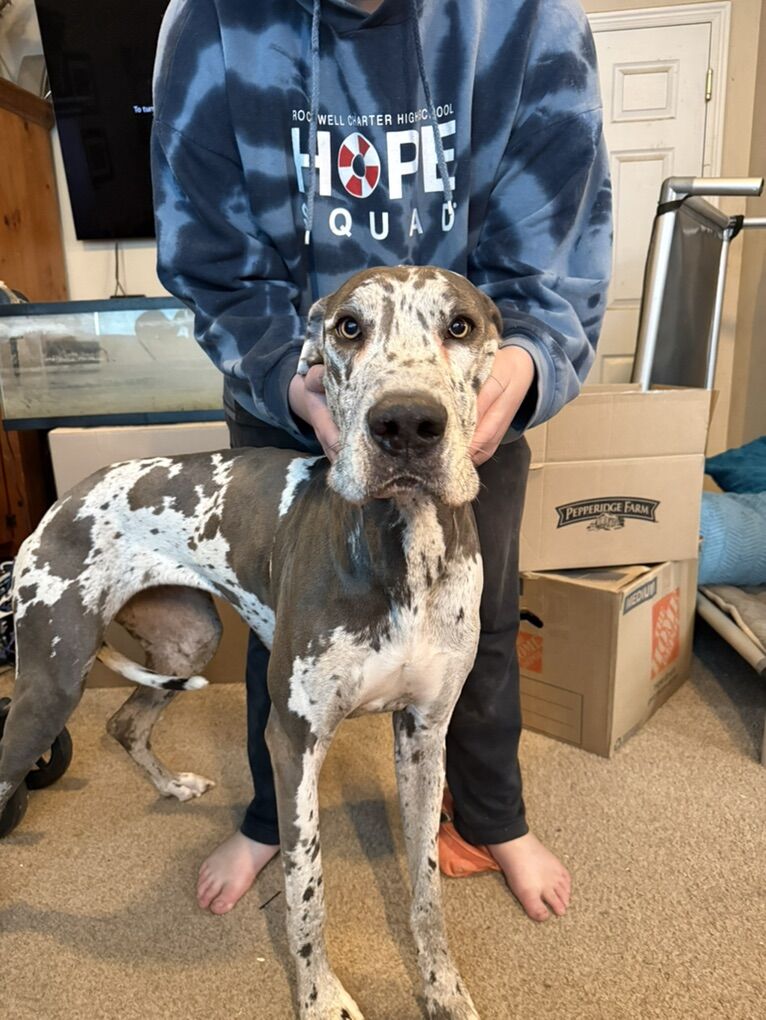 ApplePayWe are needing to move and our new place does not accept animals. Needing to re-home our baby Phoenix. She is a 2 years old blue harlequin Great Dane. Has not been spayed. Great temperament but take a little to warm up. Loves to cuddle and play.