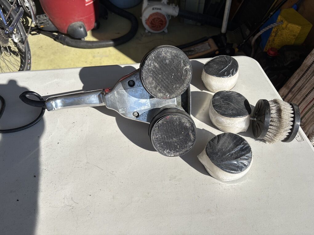VenmoAll metal. Works well. Comes with three sets of foam pads and one set of scrub brushes.