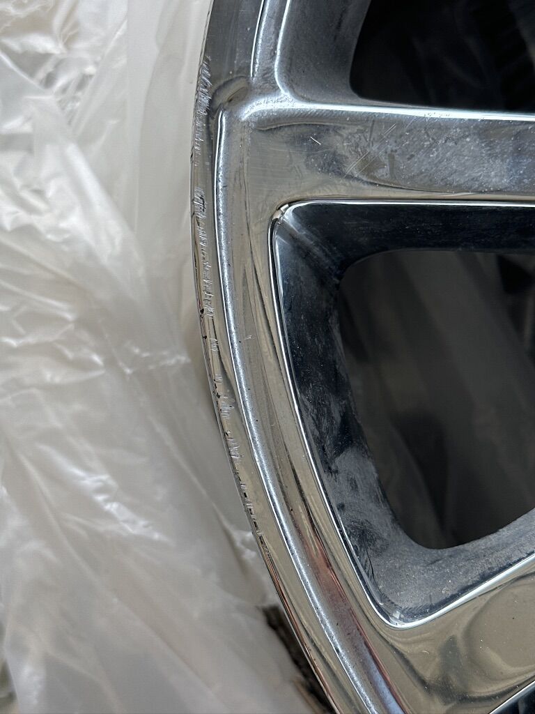 One has a little curb rash that could probably be buffed out. These were used for winter tires and only used a few months a year for the last few years. Sold the Denali so don’t need them anymore. Great condition.