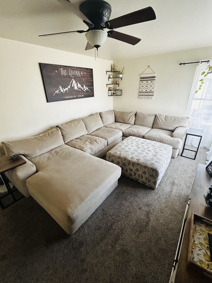 ApplePayBeautiful beige chenille sectional. 12 Throw pillows and Ottoman. Stain resistant with removable, laundry safe cushion covers. We are moving and need gone ASAP. Selling for best offer. 🤍