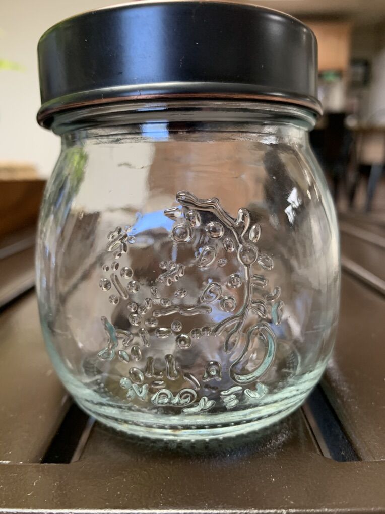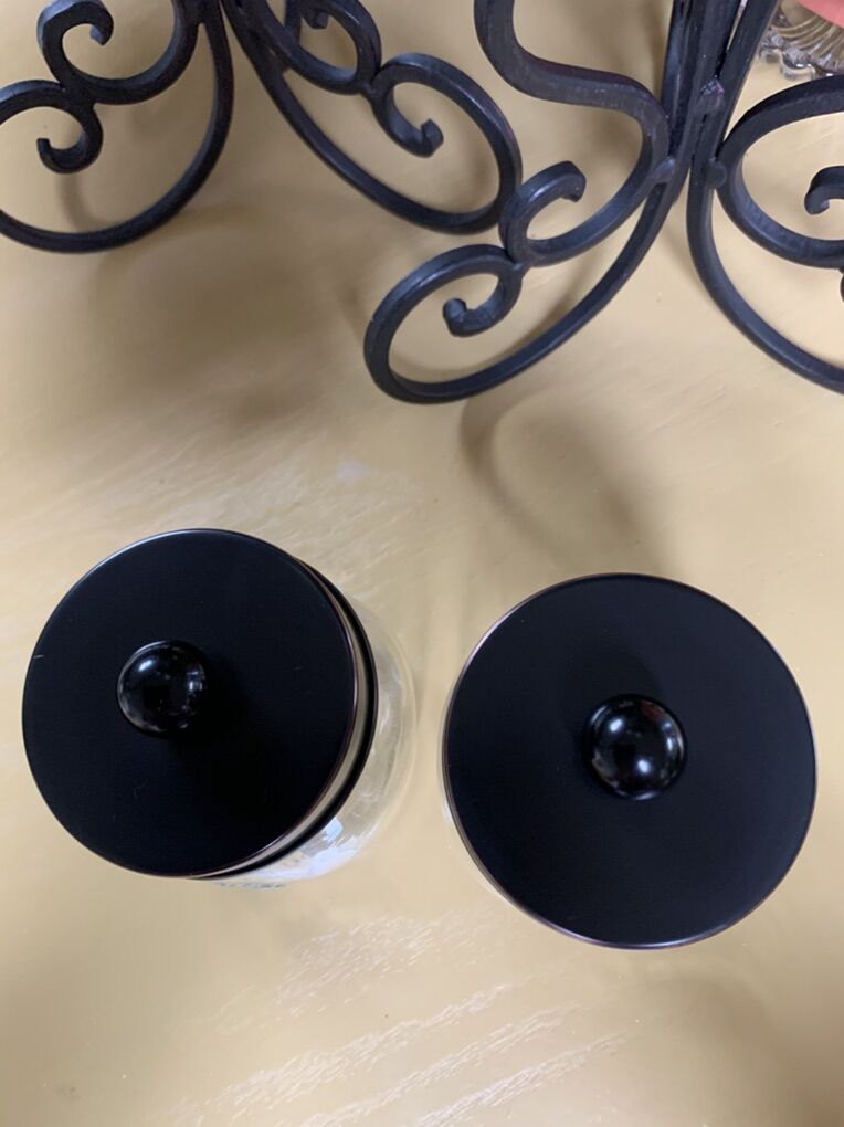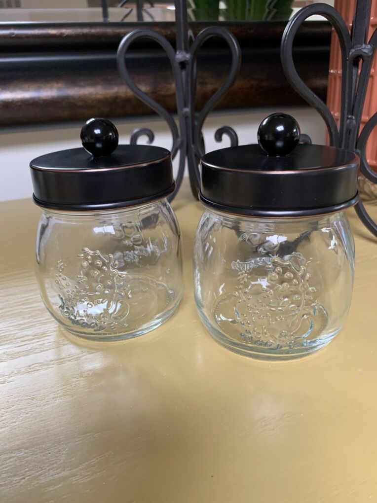 Venmo8oz apothecary jars. 2 sided embossed floral designs on exterior. The metal lids pull off making it easier to lift off the top and reach in the items inside. 4 1/2”H x 3 1/2”W. Fill them up for a perfect gift. Clean and ready to go. Non-smoking/No pet home.