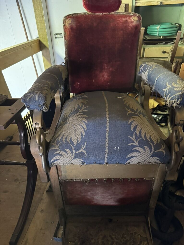 Chair shows age-appropriate wear to upholstery and finish (see photos). Frame is sturdy and complete. Perfect for restoration, barber shop décor, man cave, or collector display.
