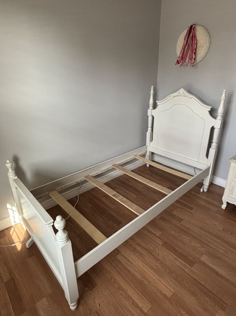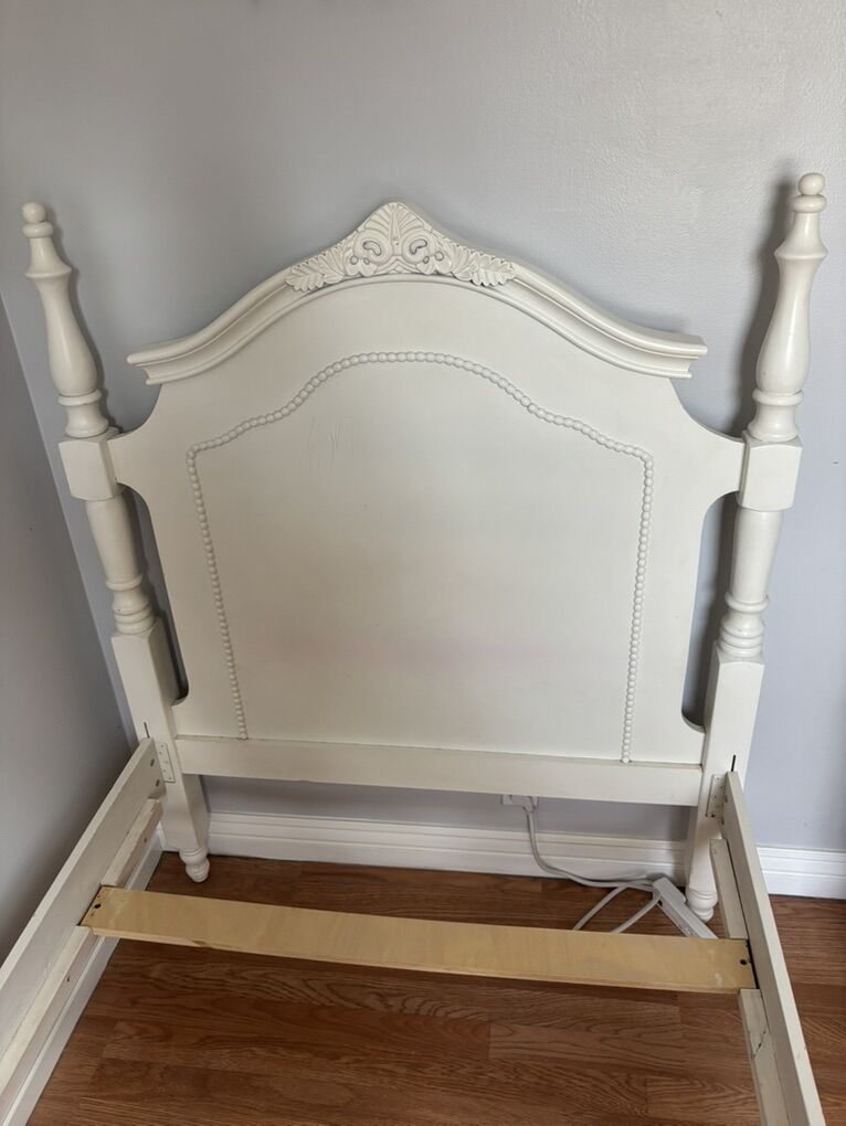 VenmoSuper cute white wood twin bed. Has nice spindles flourishes and beading. Daughter outgrew. Nice condition. Some scratches but could use a touch up. No mattress. Need bunkie board or plywood support.