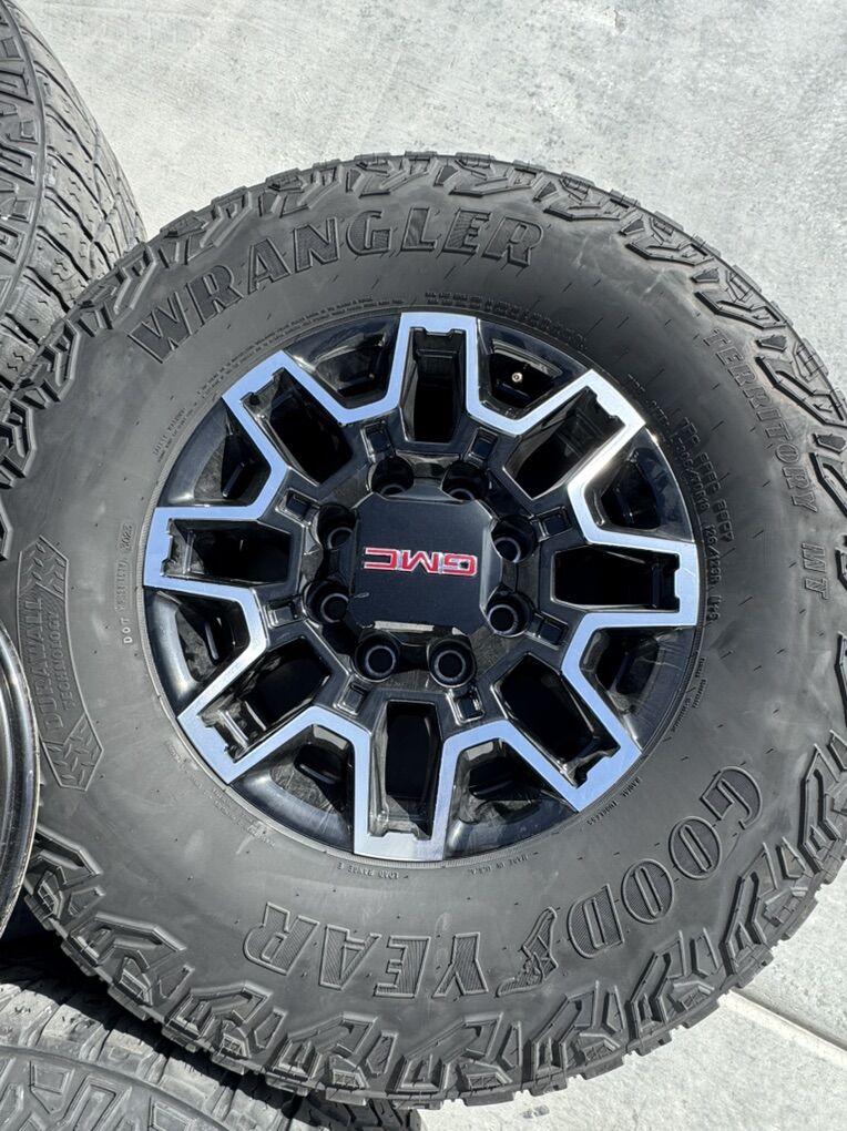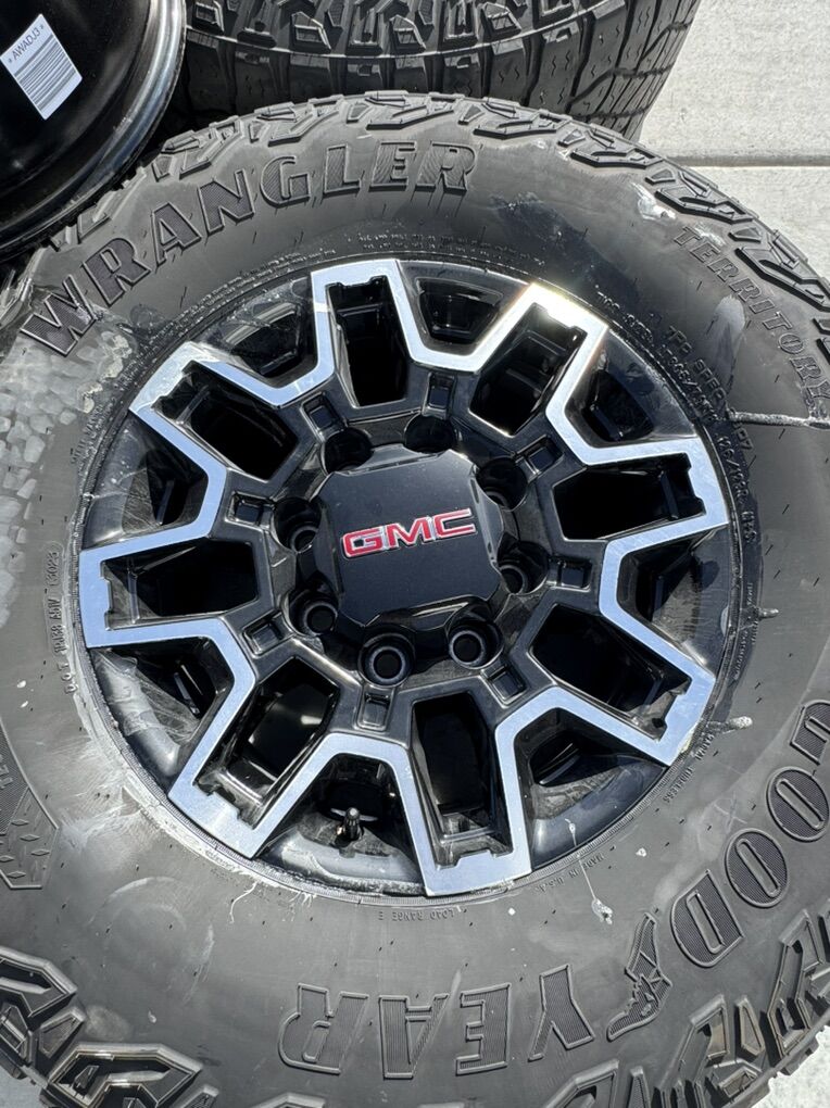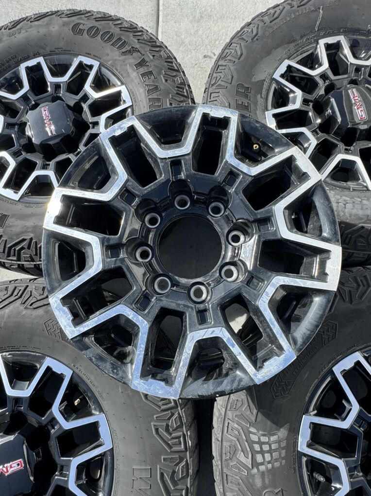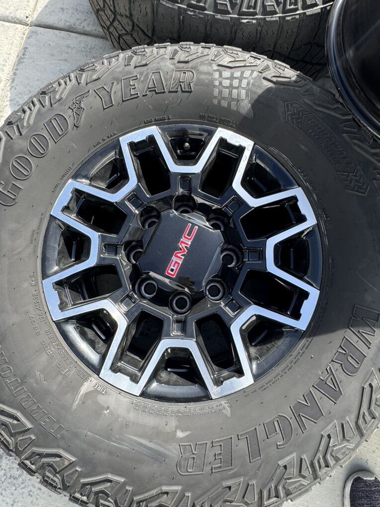Selling a set of takeoff wheels from a 2024 GMC Sierra 2500 AT4X with 31,000 miles. There are 5 wheels, 4 center caps, 4 Tires, and 32 lug nuts included in this sale.