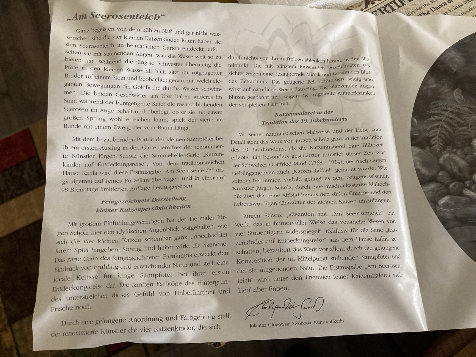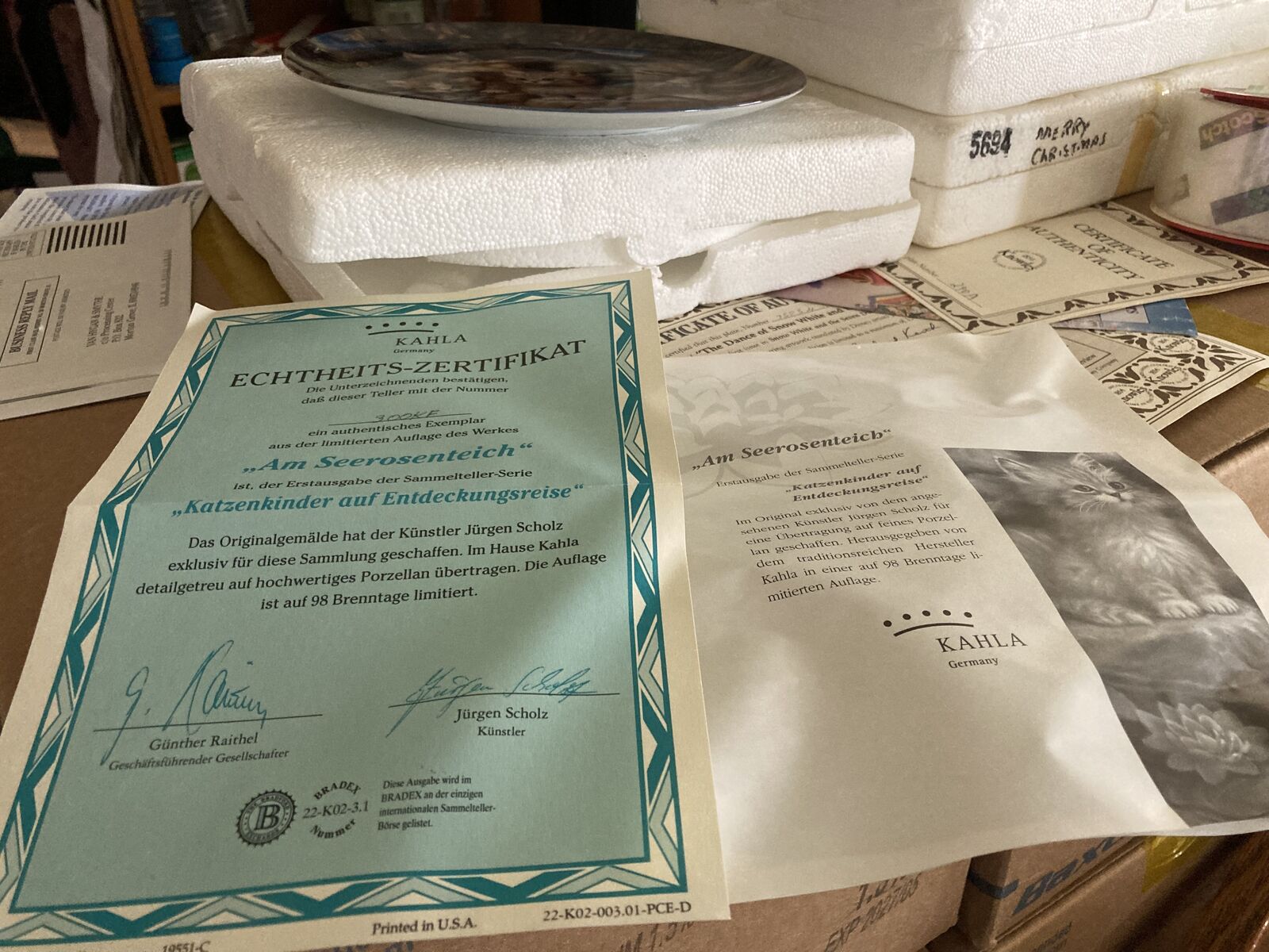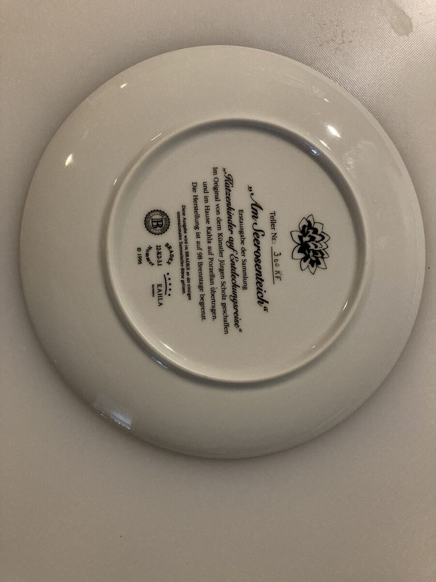 ZelleThis is plate number 300KF of a limited edition of Jurgen Scholz's "Am Seerosenteich" as re-created on fine porcelain. "Am Seerosenteich" translates as "By The Lily Pond" and is the first issue of the Kitten Expeditions collection from Kahla of Germany.