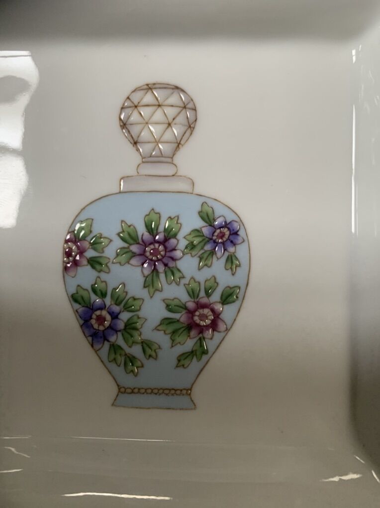 VenmoBeautiful raised details of a perfume bottle, on this colorful and elegant hand painted ceramic trinket dish, with gold trim. 5”square edge then tapers in. Clean and ready to go. Non-smoking/No pet home