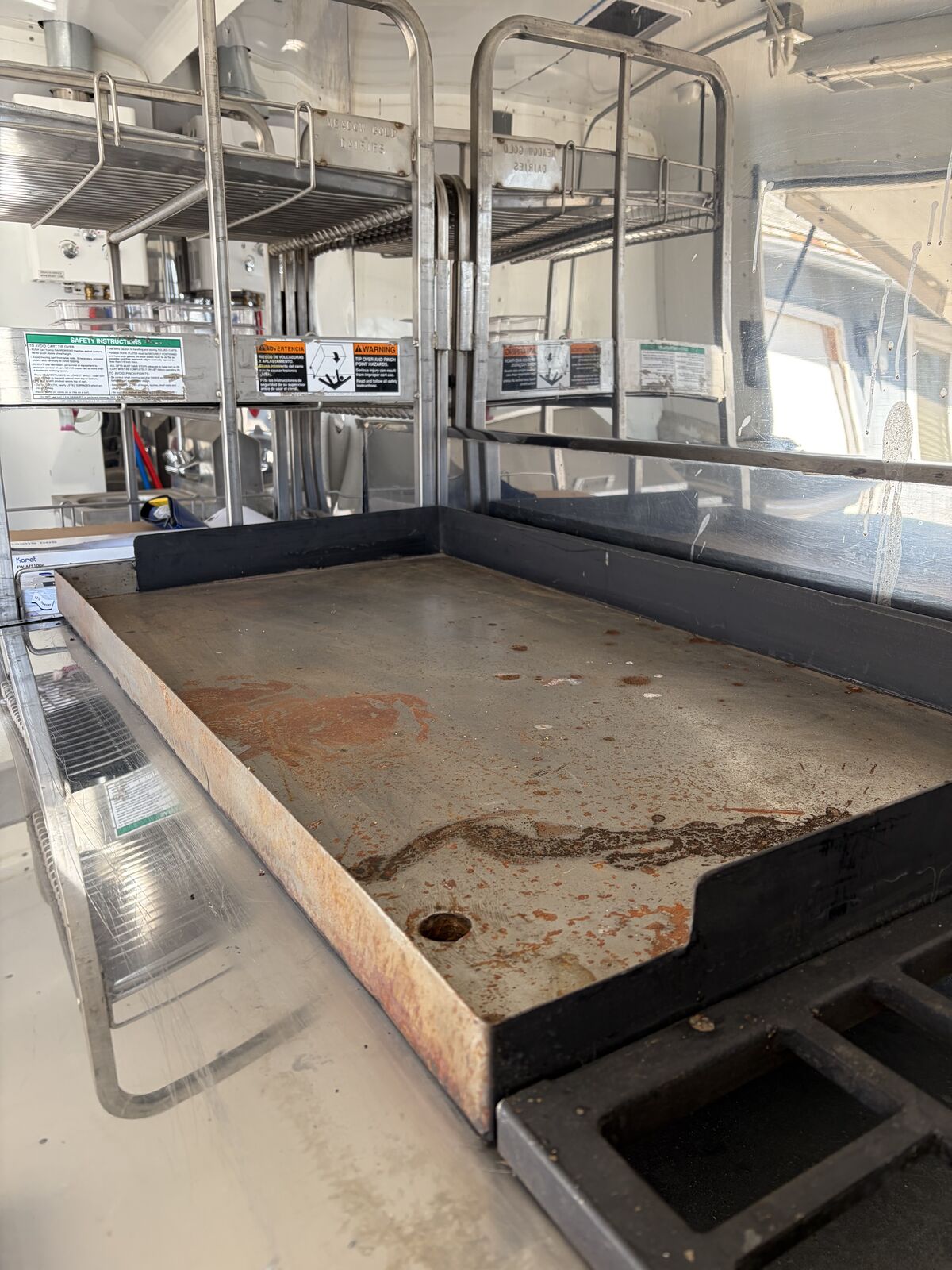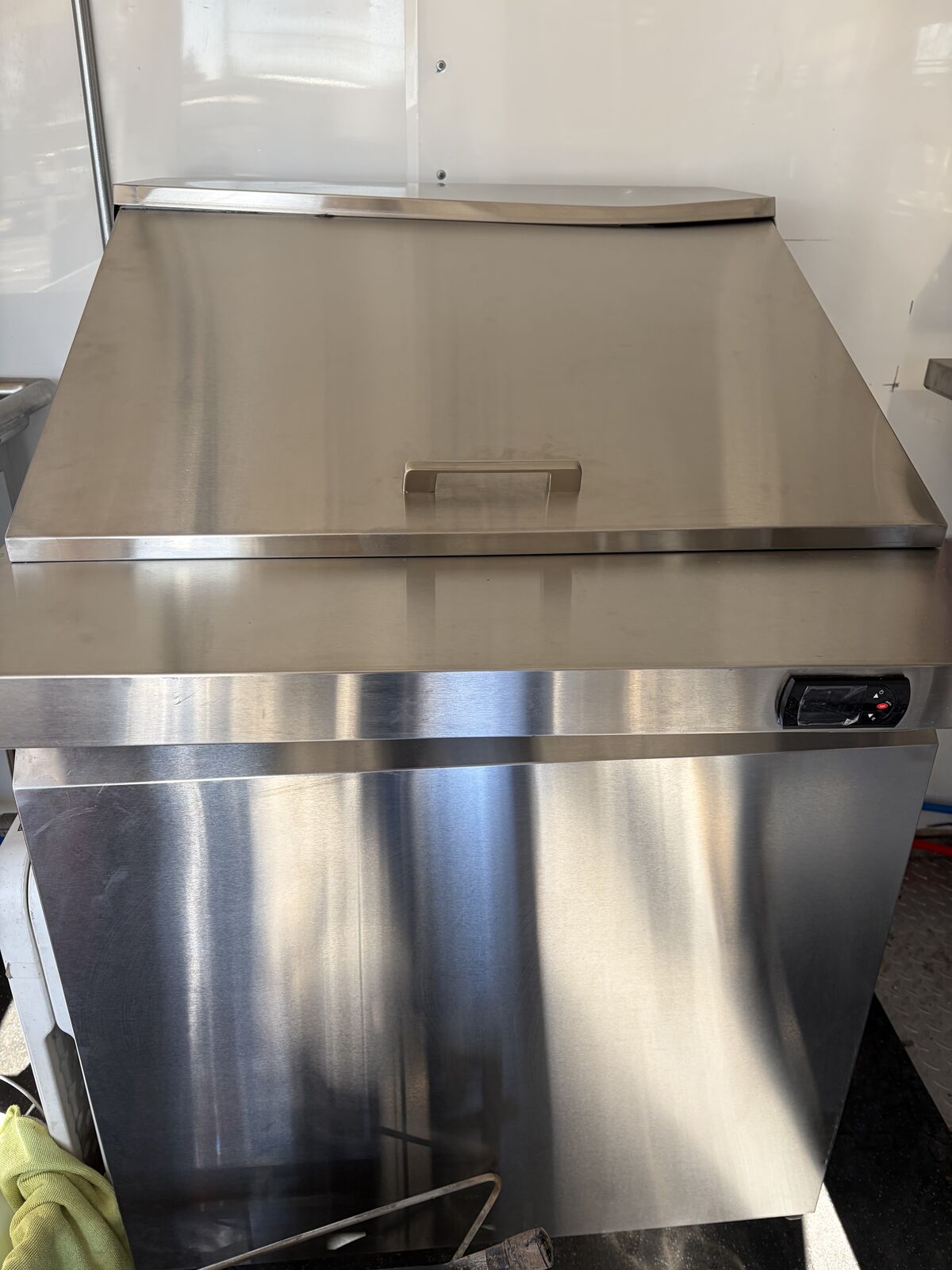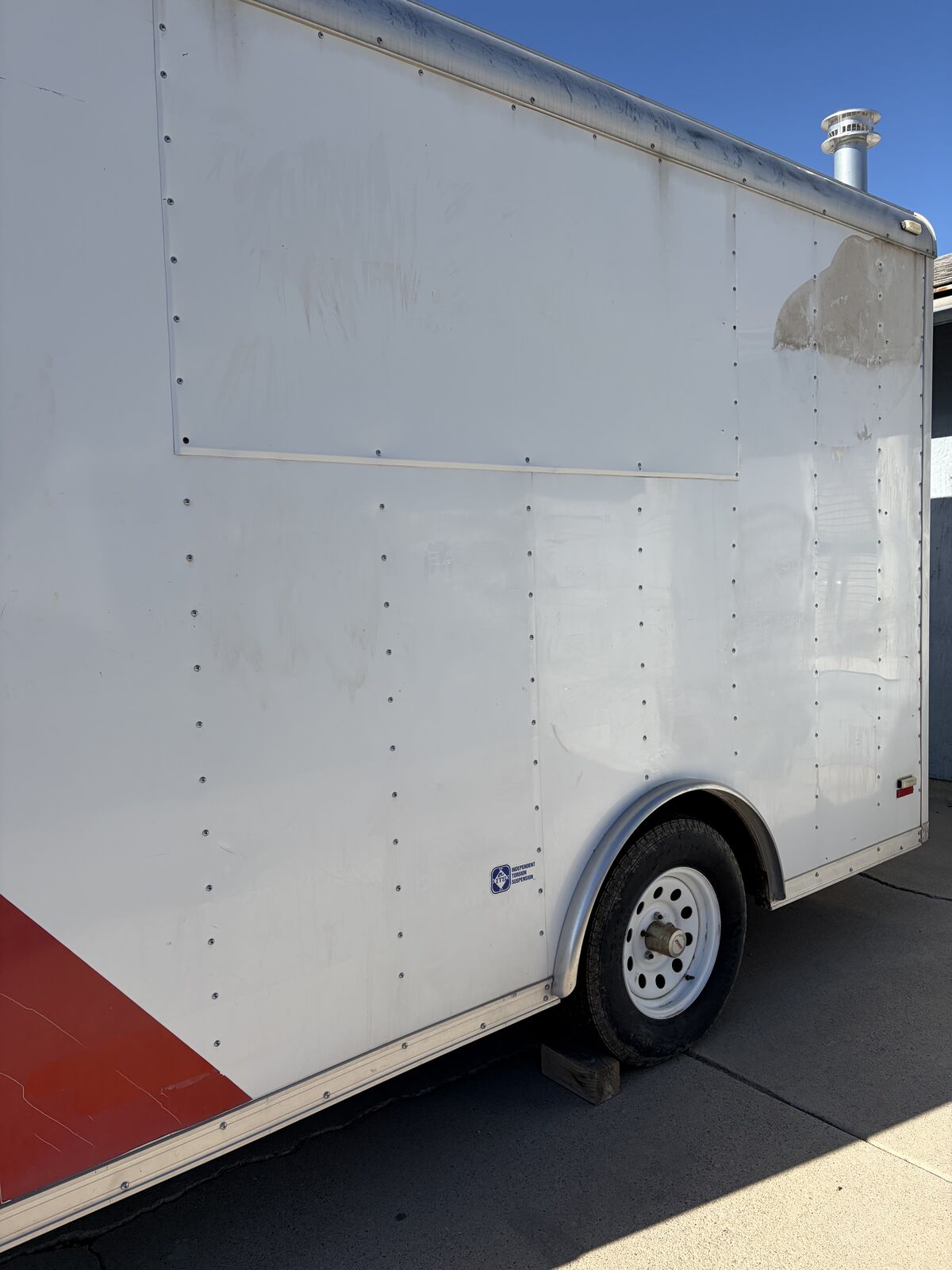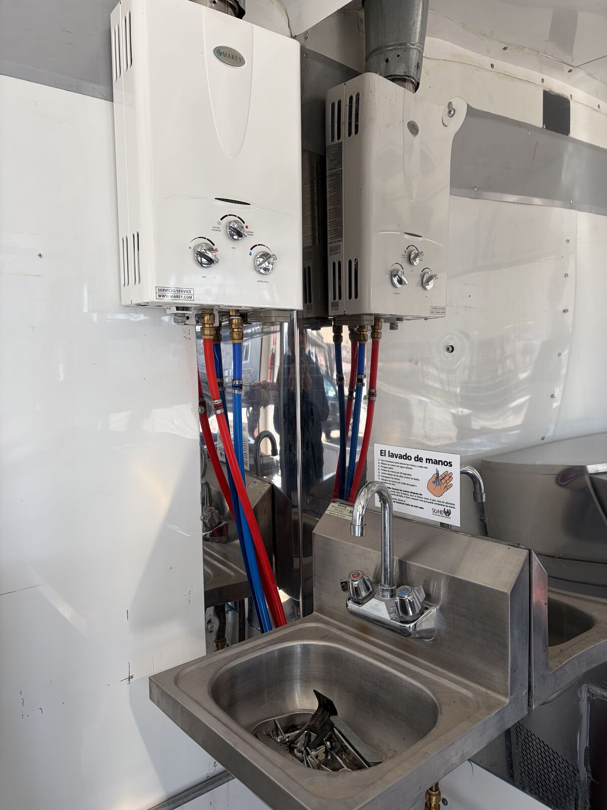 2 side by side Burners w/flat grill; 3compartment sink + handwashing station; Sandwich prep table; upright standing rack to hold supplies extra & misc; Fresh water/Gray water tanks; Propane rack/tank; tankless water heater. Asking $17,500.00 OBO