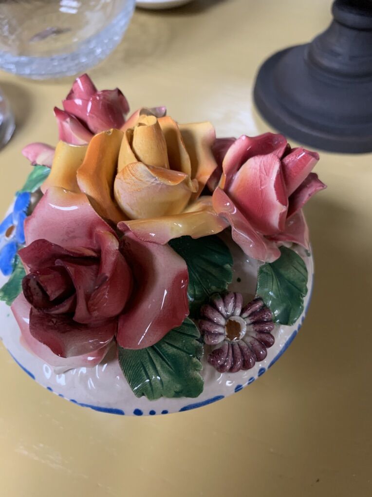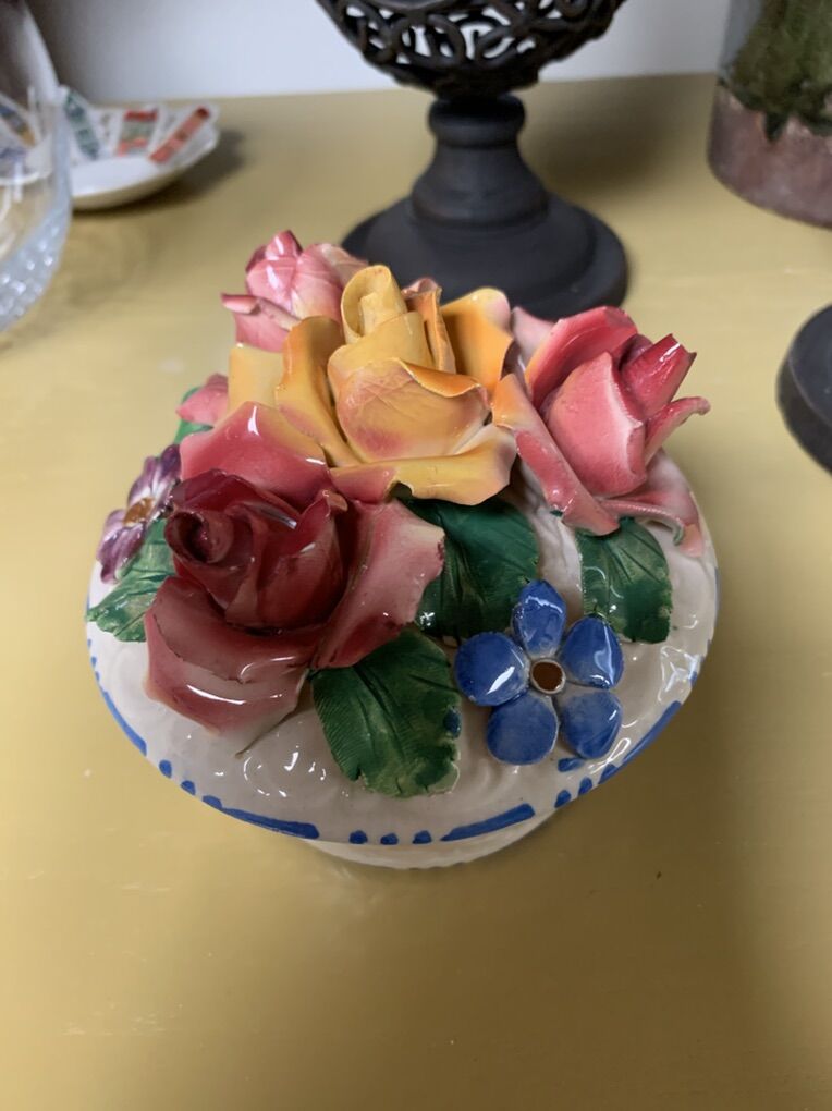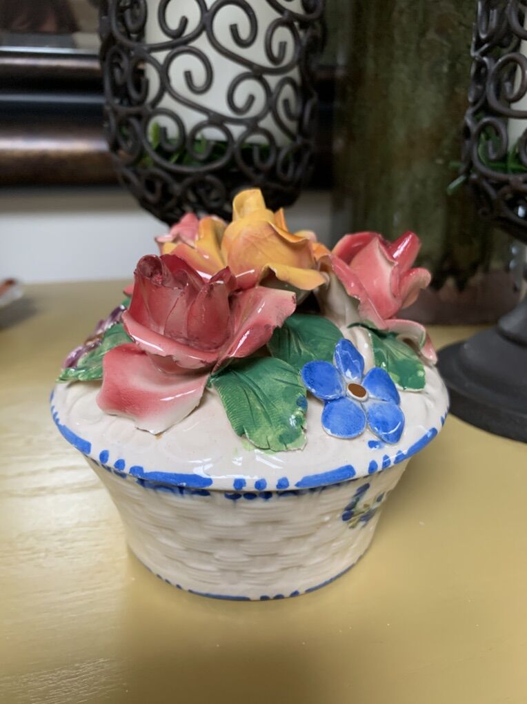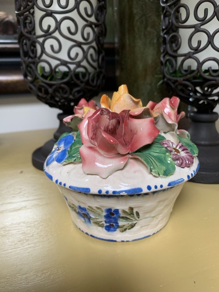 VenmoCapodimonte porcelain is renowned for its intricate, hand-painted and hand-sculpted floral designs with a high level of detail and vibrant colors. This particular bowl, features sculpted roses and smaller blossoms. Made in Italy. No breakage on flowers. Bowl 4 1/4”, lid 5” x 4 1/2”H. Clean and ready to go. Non-smoking/No pet home.