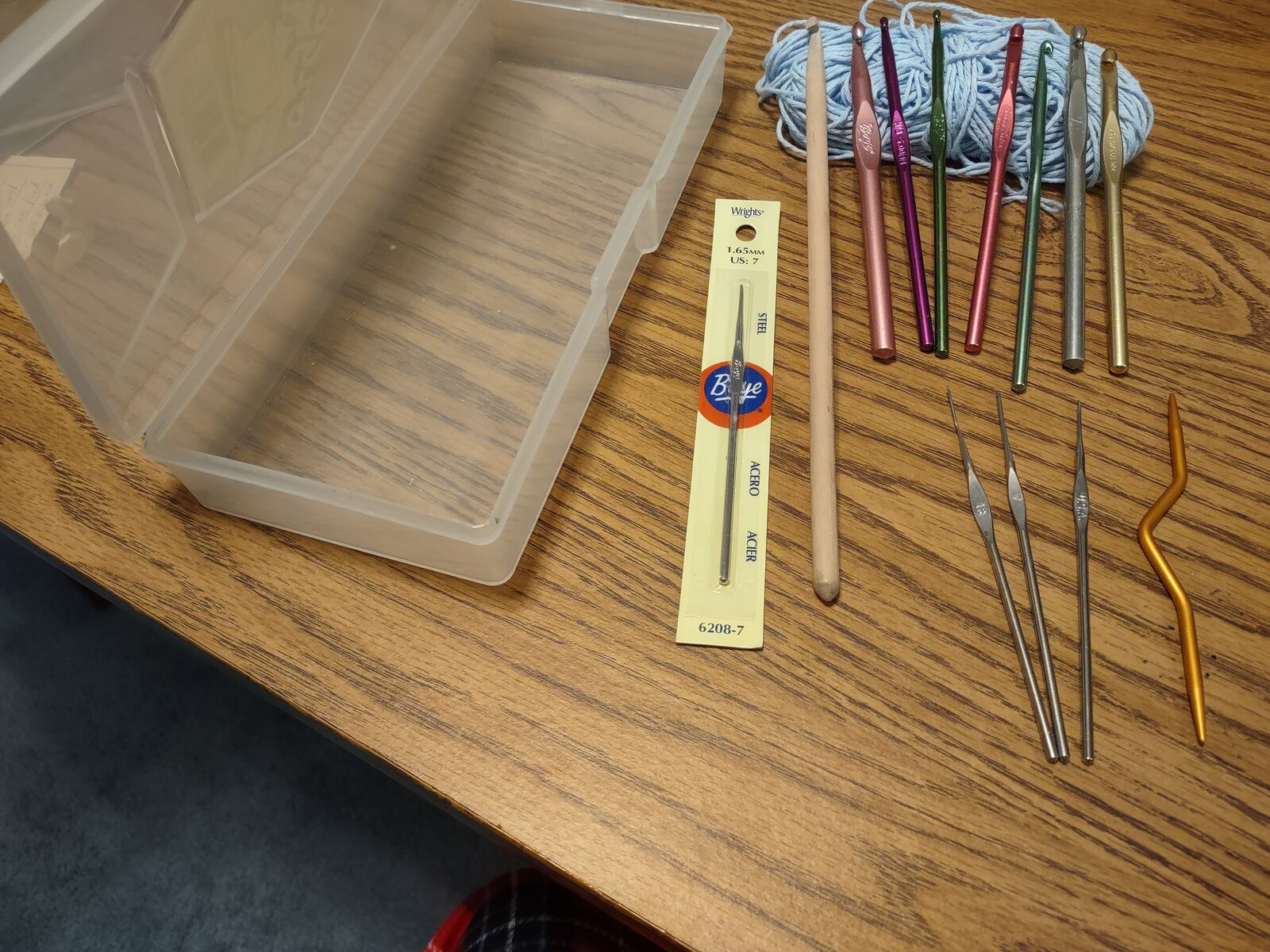 VenmoCrotchet hooks: Wooden "Hero Standard" sz 13; Metal "Boye" brand sz K (salmon color); Metal "Made in Germany" sz 7 (silver); Metal "Boye" sz 10-6mm (gold); Metal sz 19, 5.5mm (pink) Metal sz H (lt green); Metal sz G (Dk green); Metal Boye sz H/8 5.00mm, Boye stainless steel sz 3, 7 (1.65mm) & 10. $2 each or all 11 for $20. Cash/Venmo. In Sandy. 801-201-5350. Also, "Organize It" Single Compartment Box 10.25 inches x 4.75 inch x 1.75 inch see-through storage case for all your hooks available for $2 in second photo.