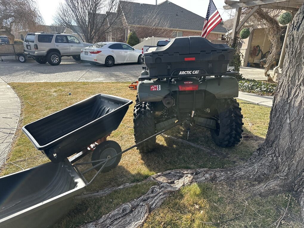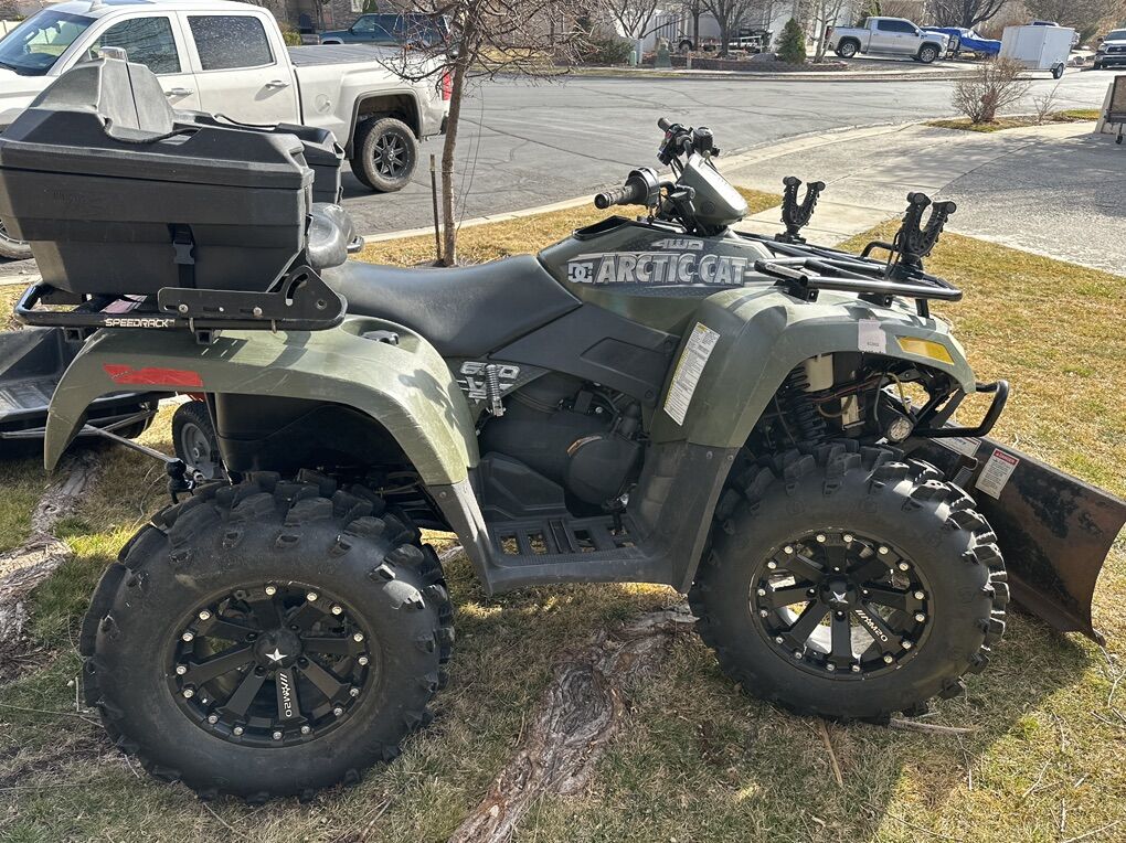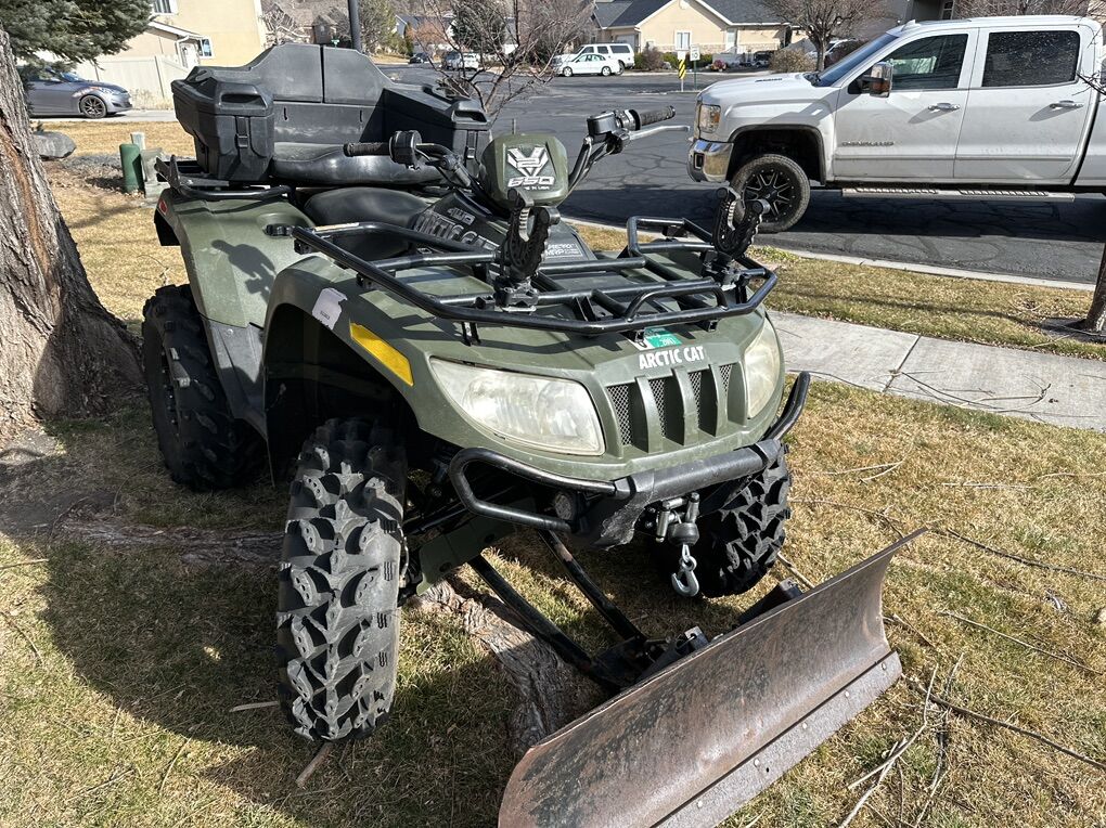 ZelleThis is a 2006 arctic cat 650 V twin ATV. It features the legendary Kawasaki 650 V twin motor. It has electronic shifting four-wheel-drive and locking differentials. It also has a rare pull start in case the battery ever dies out on the trail. It also has the speed rack multi rack platform. Brand new air filter, oil filter and fresh oil. The wheels and tires are nearly new and in great shape and look awesome! It comes with the rifle rack on the front end, oh that I also use for my bow. It also has a rear seat that works great with the foot pegs that I added as shown in some of the pictures. I also have a hard case rifle scabbard that I will throw in. I still have the factory wheels and tires that have tire chains on them that I use when plowing snow. The snow plow and the dump Boll wagon trailer are all included. It also has a brand new winch cable that has never been used.