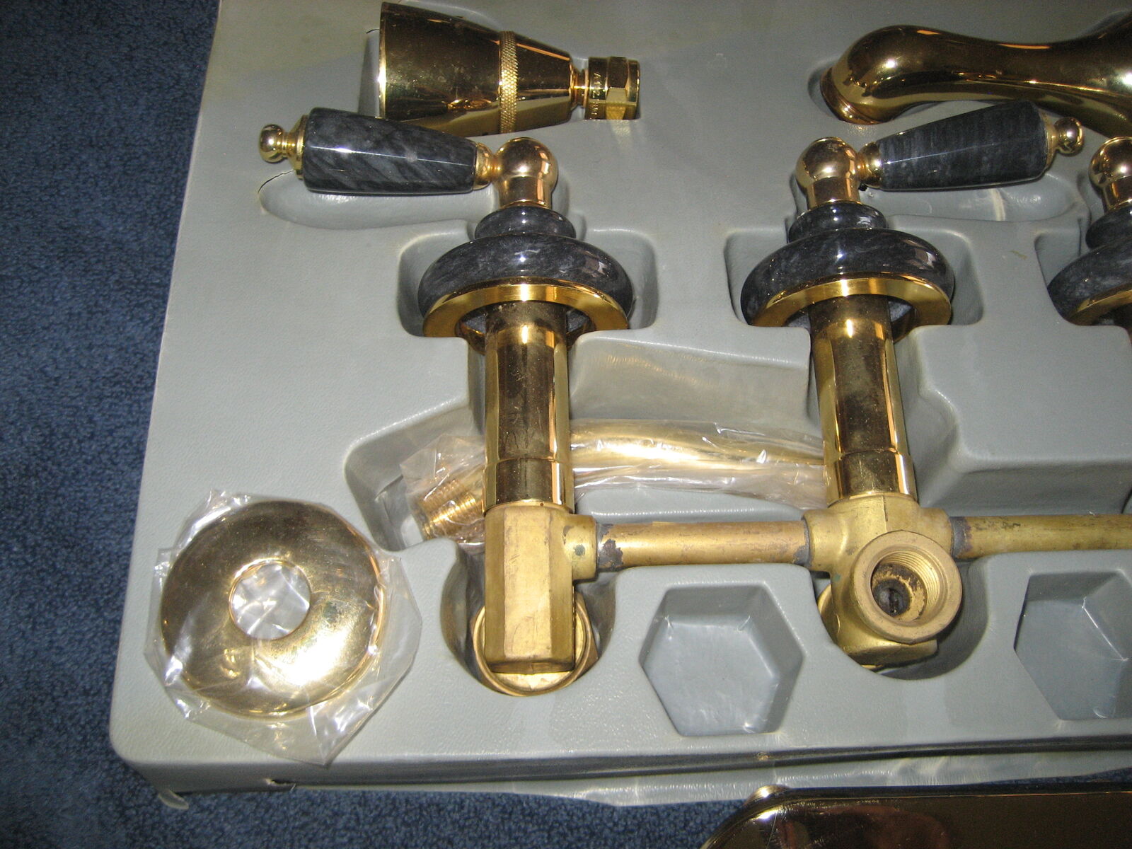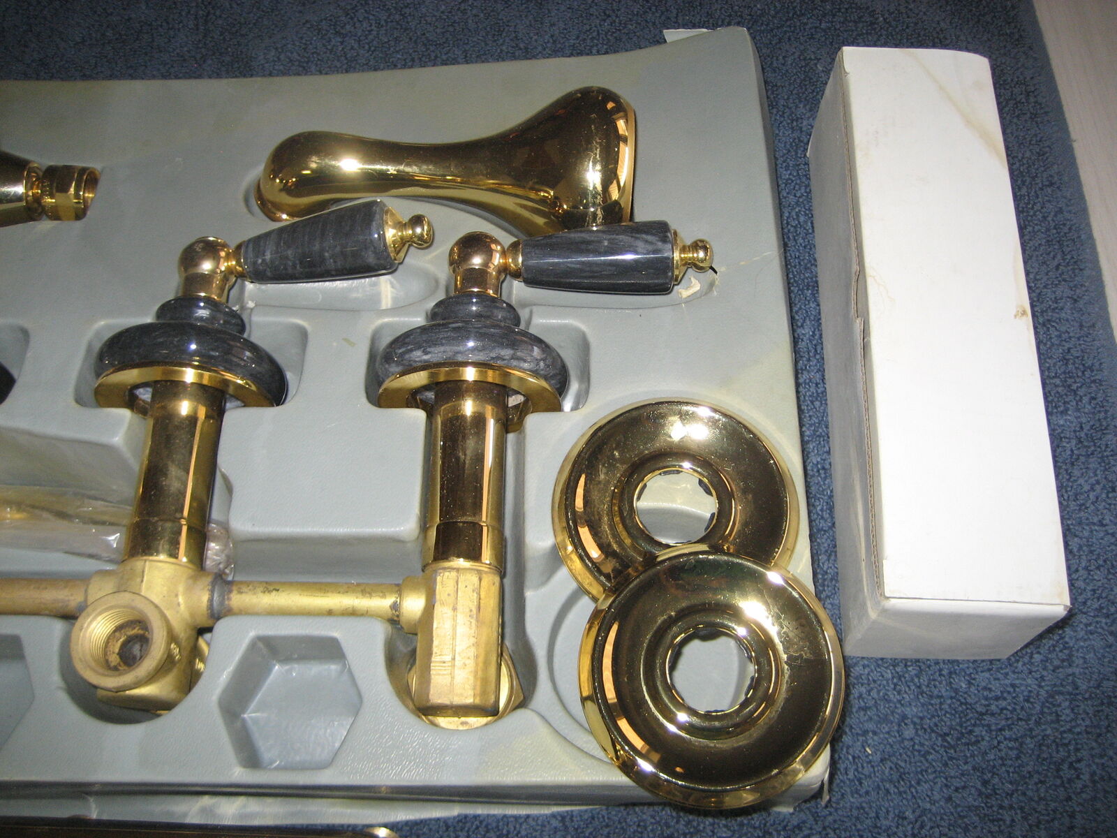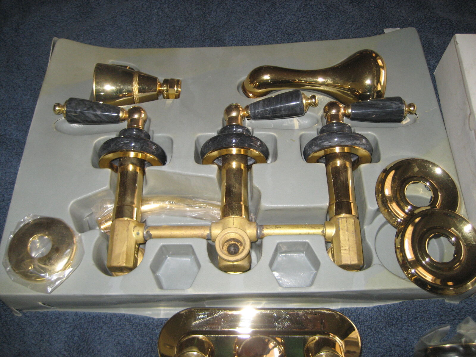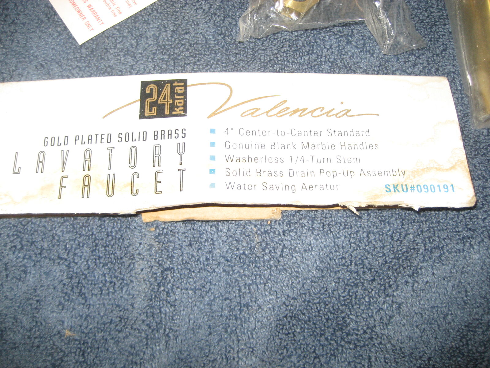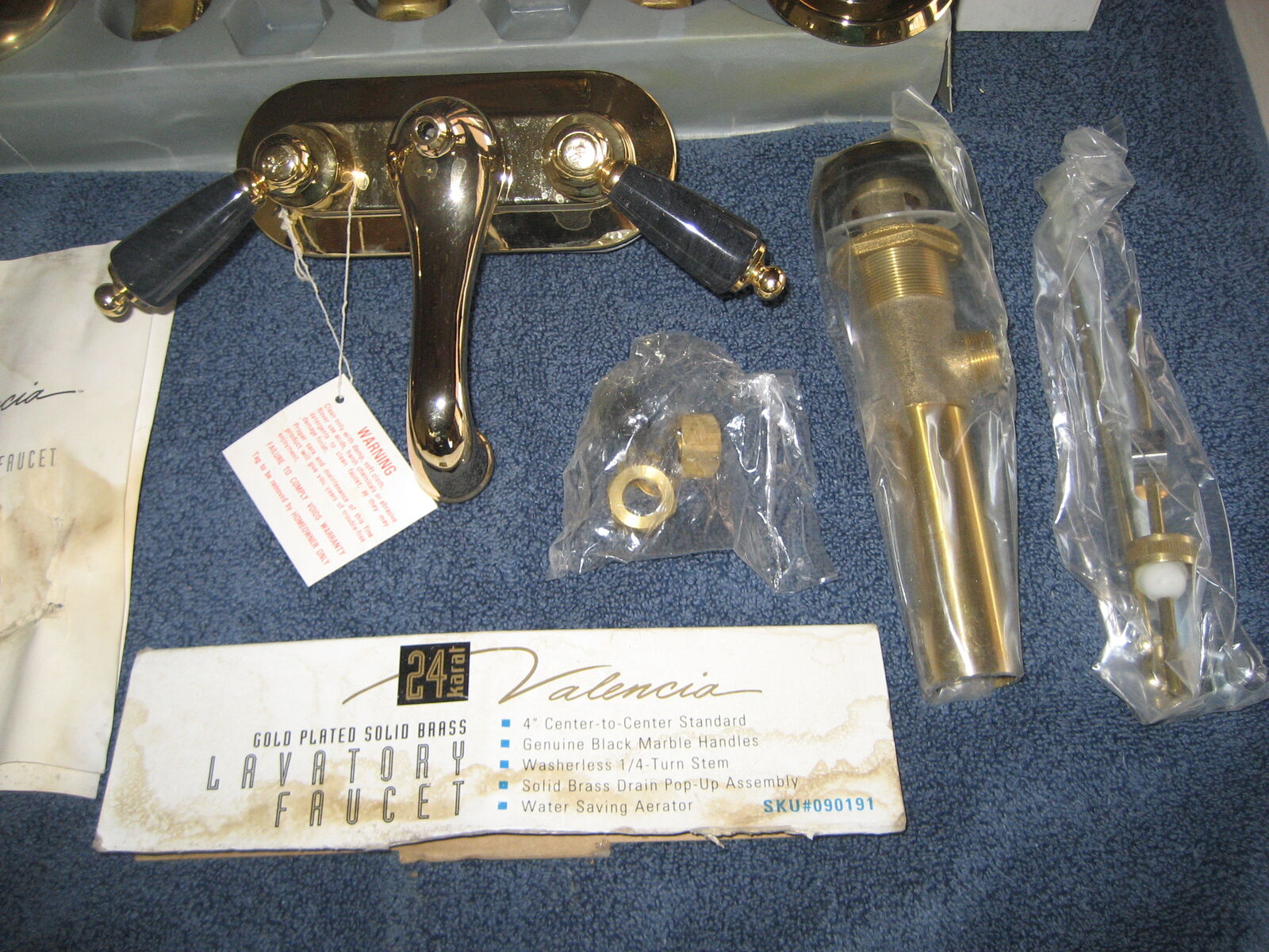 One NOS Vintage valencia 24 Gold Plated Lavatory -tub & Shower Set. 4" center to center standard Navy Marble handles. Washerless 1/4-turn Stems. Solid brass 24 Karat gold Plated. Water saving Aerator. believed to be from the 1980s or 90s. origional box had water damage but Hardware is like new. Comes with instulation and care instructions. for an Elete Bath instulation.
