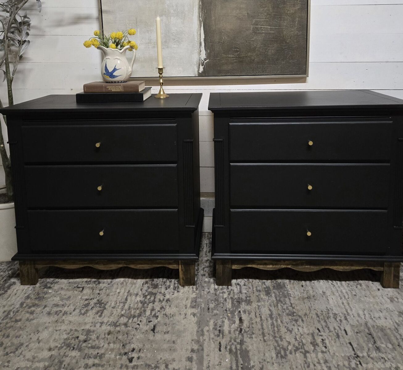 VenmoLarge solid wood nightstands. 3 dovetail drawers that work great. Top drawers Is felt lined. Refinished in black with brown scalloped bottom. 30w, 18d, 29t.** No holds, price is firm.