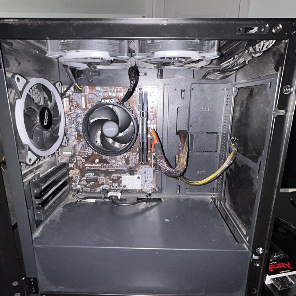 What is there: Motherboard: MSI A320M-A Pro Max CPU: AMD Ryzen 3 3200G Ram: 2 sticks of DDR4 8GB per stick 3 cooling fans Power Supply: CX500