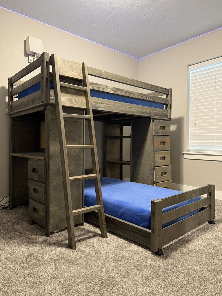 Features two beds, one desk, a lot of storage and a beautiful color