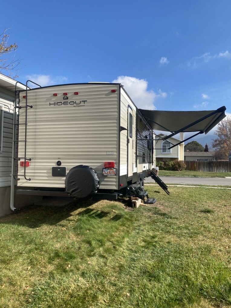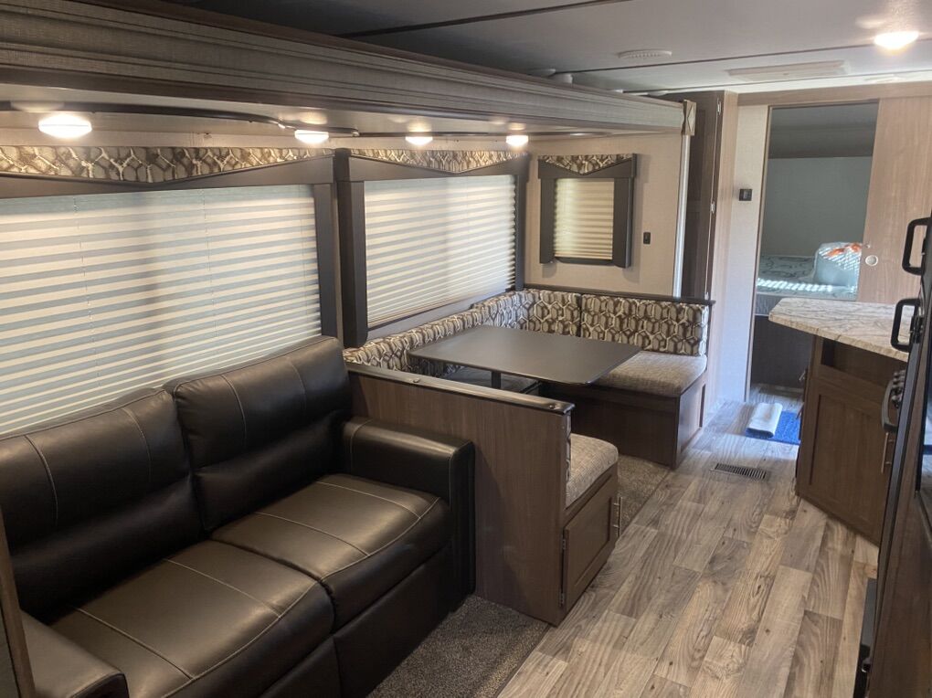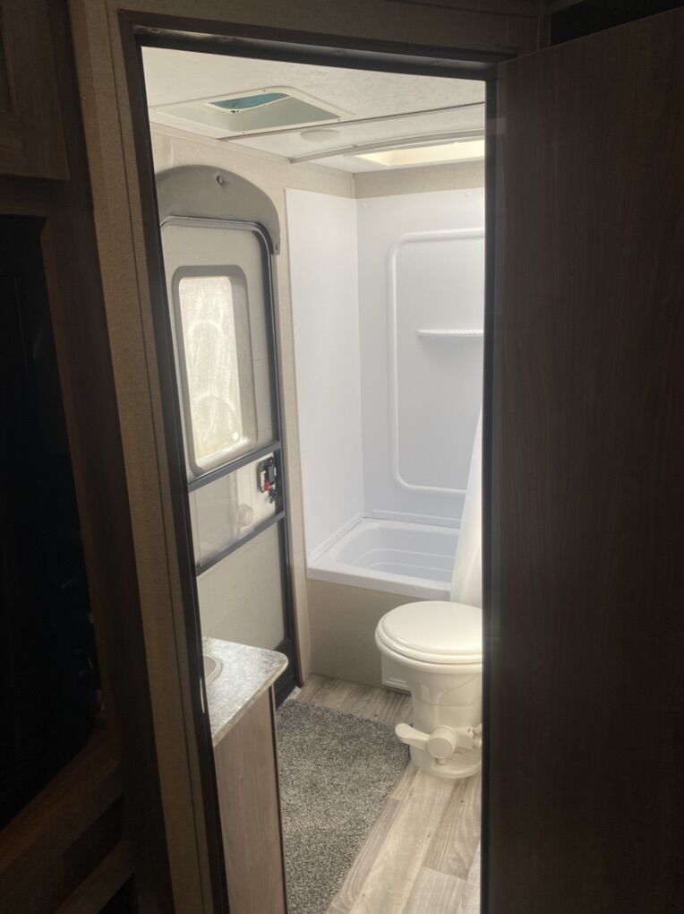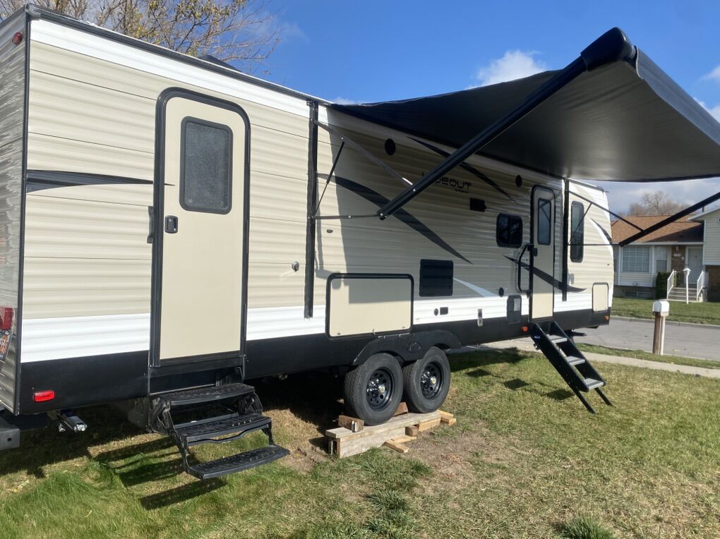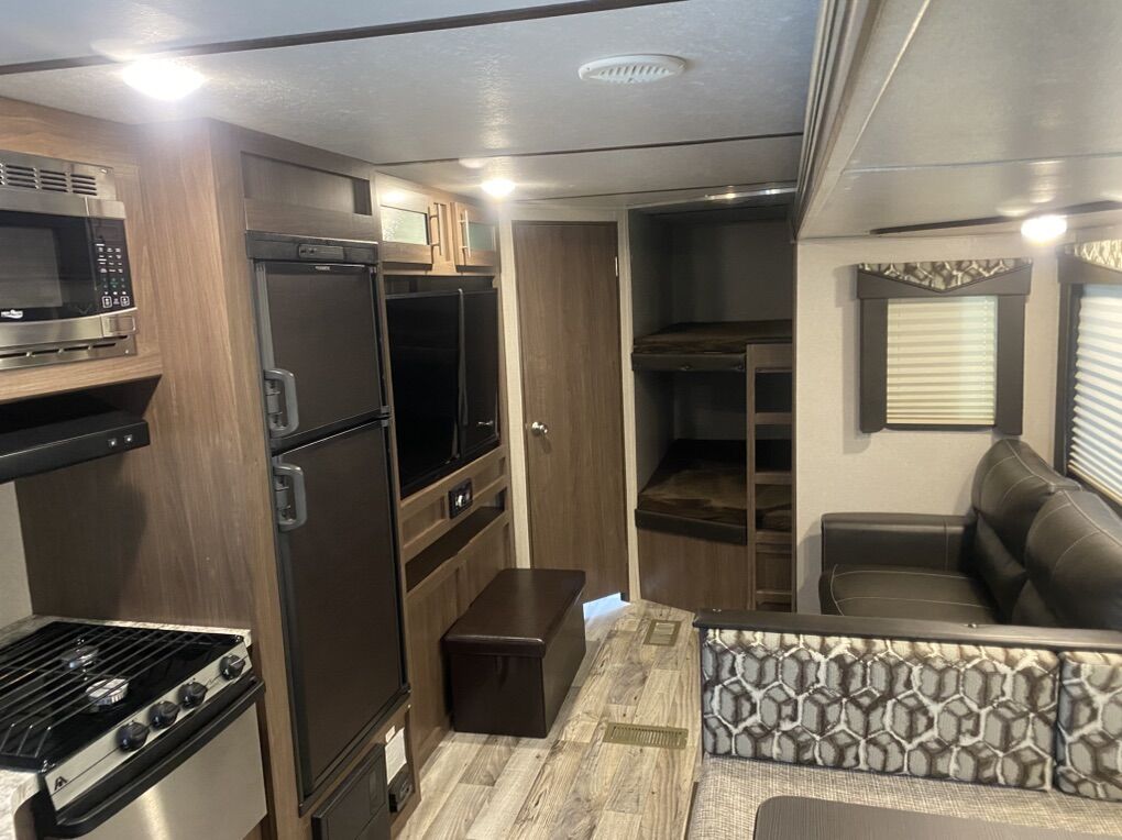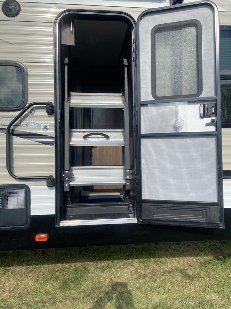 Pristine condition, original owner and has rarely been used. Has traveled less than 2000 miles since new and may have stayed in it 3 or four trips. Never been pulled on dirt roads.This is a must see to appreciate and a rare find that would save thousands from a new one because this trailer is basically new. Trailer has many upgrades including 100w solar panel and battery charge and 2 - 6 volt golf cart batteries wired to create 12 volts for the trailer. This is a great system and you will have power for a long time. Many other accessories will be included. It is great for weekend trips with a large family and will sleep up to 10 people. Has two double bunk beds in the rear that will sleep 4. Couch will sleep 2. Dinette will sleep 2 and the master bedroom will sleep 2. It has a large tv and stereo system that will also play outside. It has a U-shaped dinette. Central heating and central Air Conditioning . Has a stove with an oven, microwave and large fridge. Note must be connected to an AC source such as a generator to run Air Conditioning, Microwave and AC outlets. There is a nice bathroom with a small tub and shower. Has 1 large slide out for kitchen and living area. Has a CO2 detector and smoke detector. Front master bedroom with closing door. It has an outside shower, a small outdoor kitchen with fridge and cooktop. Nice power awning with led outdoor lights. Nice pull down entry steps. Electric tongue jack, plenty of outside storage compartments and many other features. It has a water flush system for cleaning black water tanks. Items included: equalizer hitch, Anderson leveling system with stabilization blocks, extra drain hose with v connector to drain black and grey water at same time when connecting at a park, includes fresh water hose with pressure check valve and filter. Also a extra water heater anode. If interested come check it out so you can appreciate how well maintained this trailer is. Asking $17,000 and it is worth every penny. A reasonable offer may be accepted. No scammers please and only seriously interested contact us. You will never find a used trailer in a dealership in this condition so check it out.