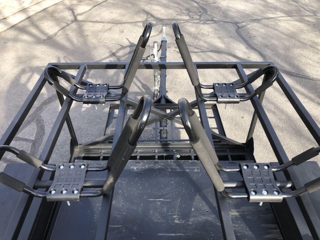 Never get caught again trying to strap multiple kayaks onto your rooftop when you use this really cool-Kayak Trailer Package. This trailer lets you easily carry 2 kayaks safely, securely, and hassle-free. With a couple/few ratchet straps and the mounting hardware for quick placement and easy operation. The preassembled hubs provide a clean ride, and the wheels have recently packed sealed bearings for frequent use at the water's edge and through unpredictable weather. The steel load box have multiple areas to tie down your storage and belongings, and the 11-ga. steel construction ensures years of reliable service. Includes trailer, 2 kayak carriers, and chromed tires!