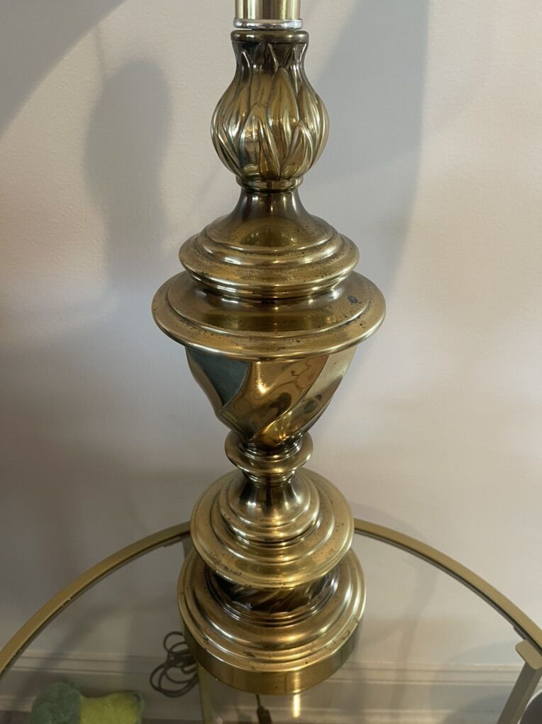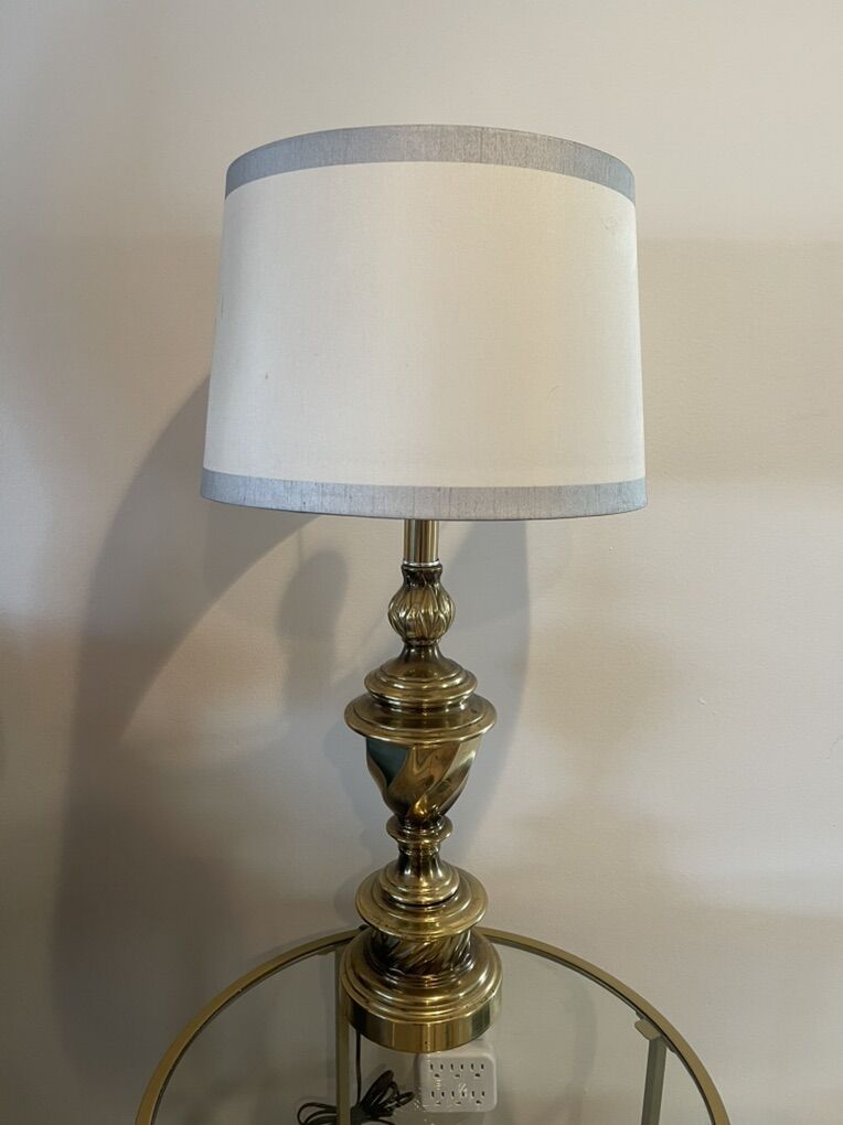 Solid brass base (heavy, not plated) Mid-century modern inspired urn design Neutral fabric shade included Fully working — warm ambient light Perfect for bedside, living room, office, or staging
