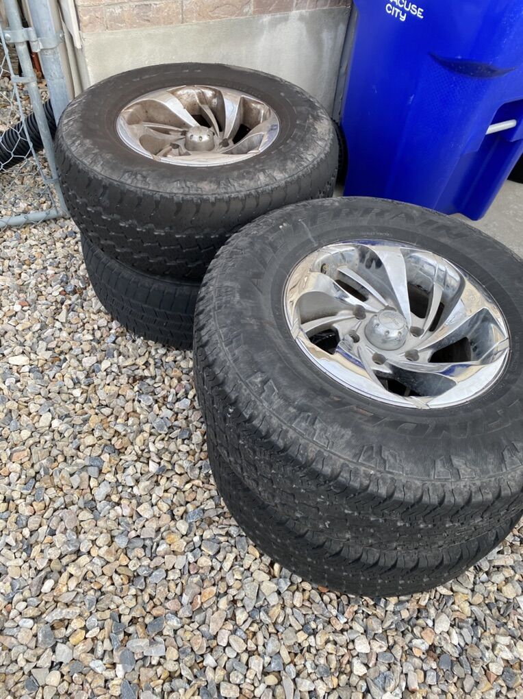 4 -wheels and tires. Tires have about 45% thread left. 265 65R16 Bolt pattern 6x5.5 “ or 6x139.7 mm ( Wheels came off 1998 Silverado) Wheel are in great shape, comes with a set of security lug nuts $275 OBO. Text if interested