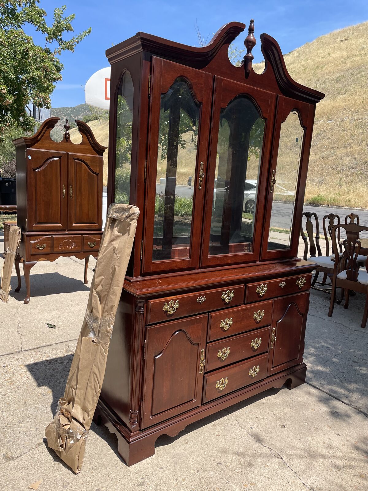 VenmoClassic style. Good condition. The hutch two separable pieces — a base with drawers and an upper cabinet with glass doors, glass shelves and lights.
