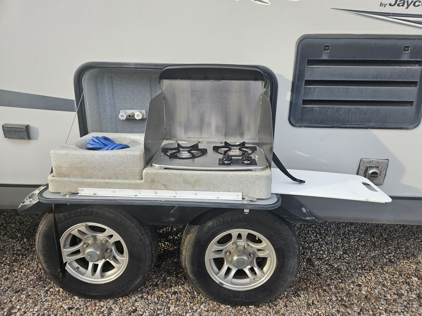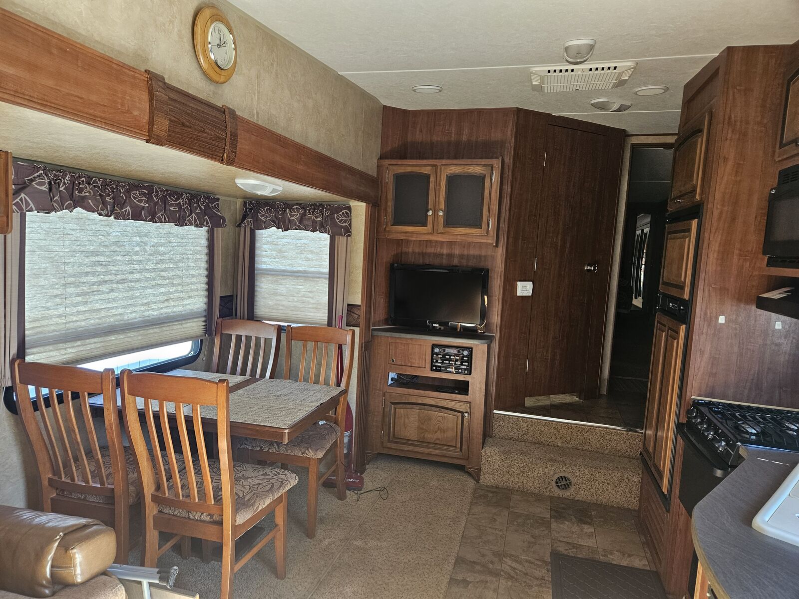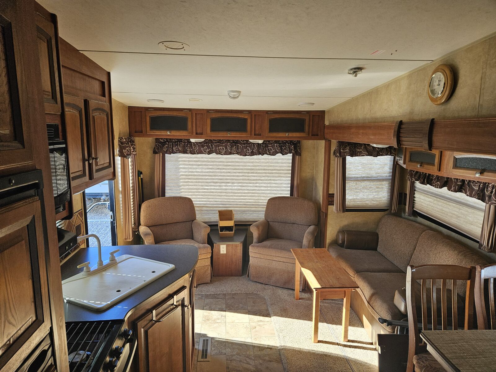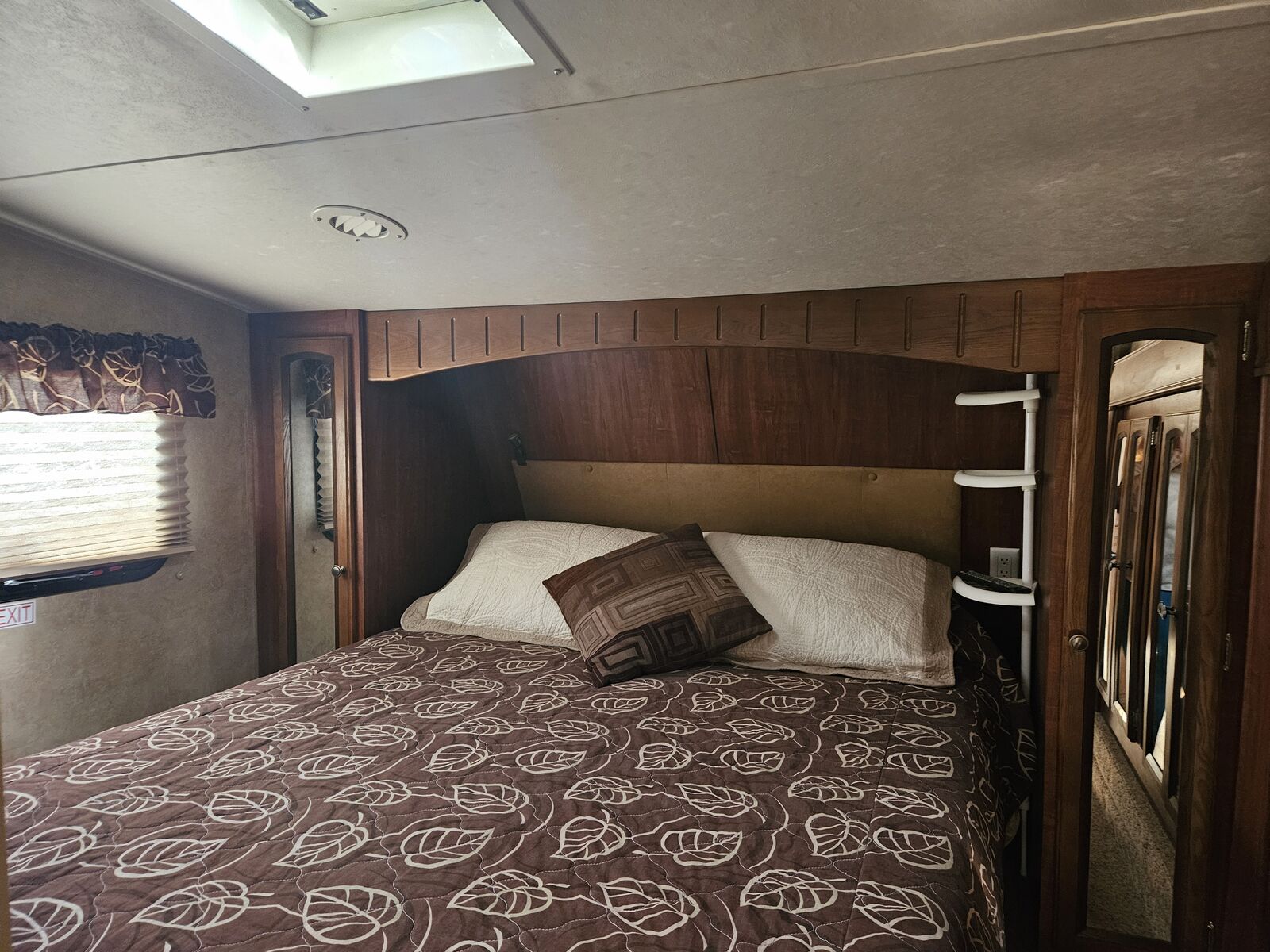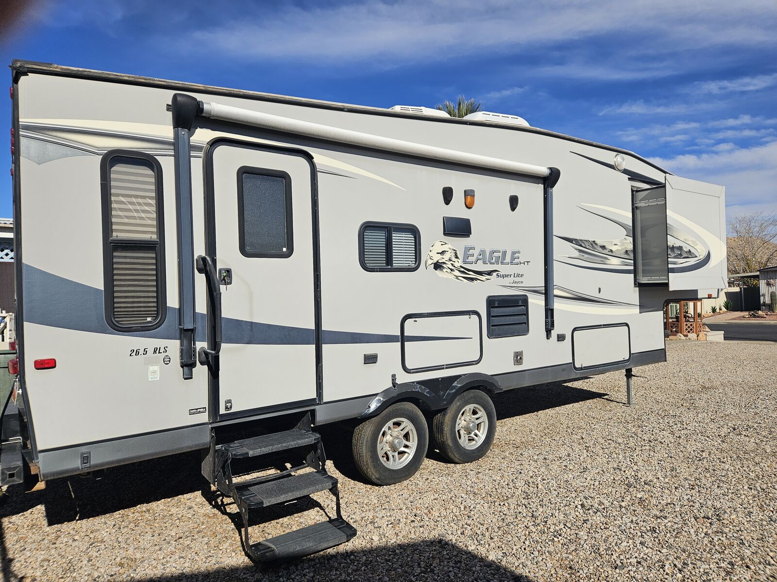 29 feet long. Original owners purchased from a dealership. This trailer has two slide outs, a large bathroom, an out door kitchen, and an out door shower. There is a full awning that is in good condition. Tires were new a few years ago and has only had one short trip on them. Has two 7.5 gal propane tanks. Added a tv in the bedroom. This trailer is in very good condition. Selling because we do not use it anymore.