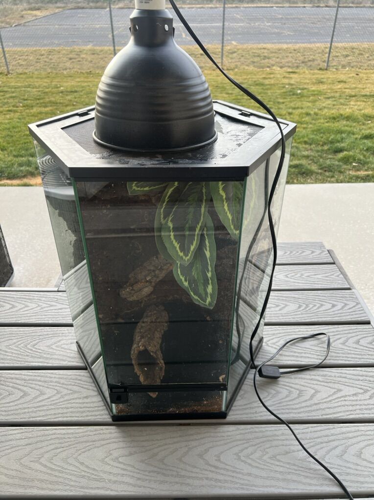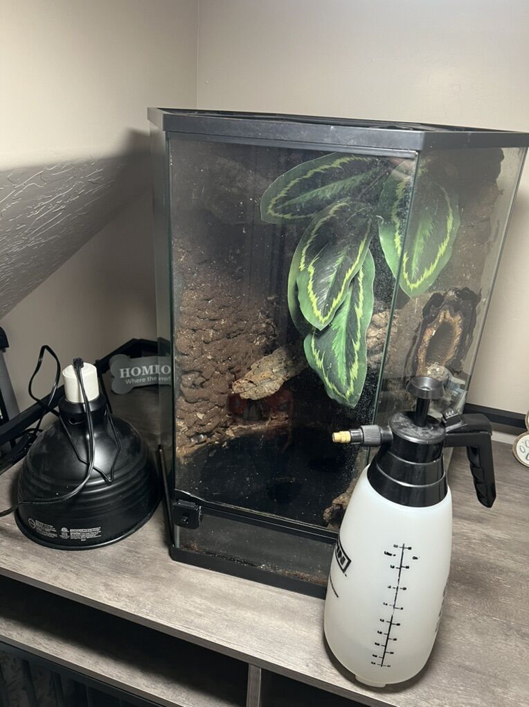 •Built naturalist background •Cork bark and plastic plants • Heat lamp • Water mister/sprayer