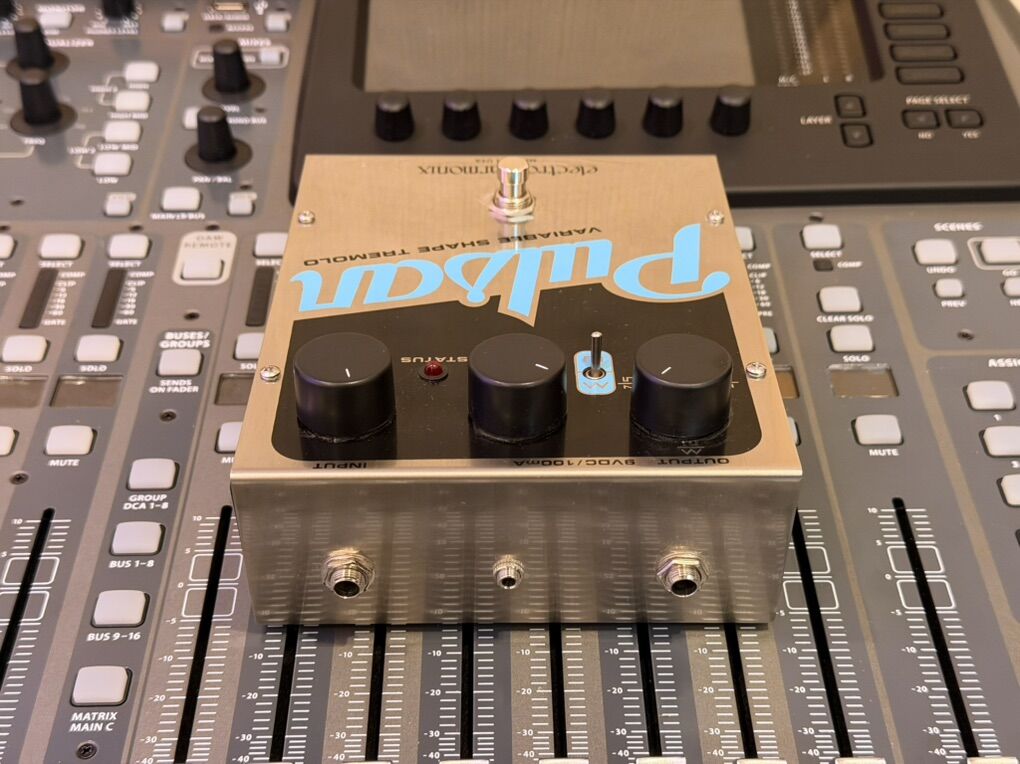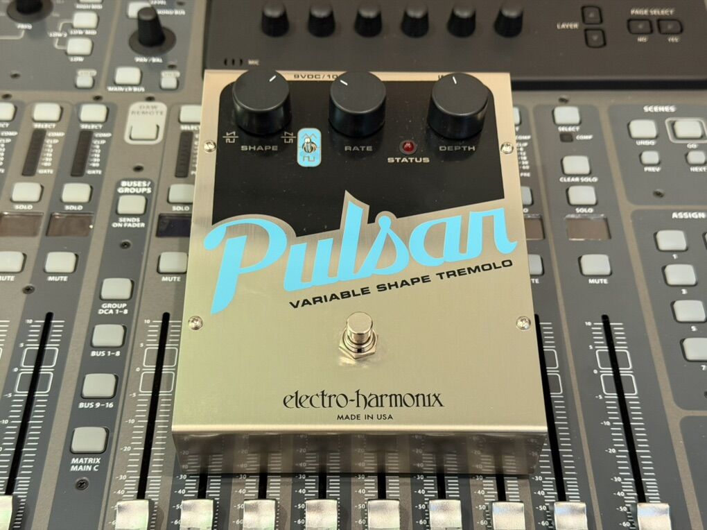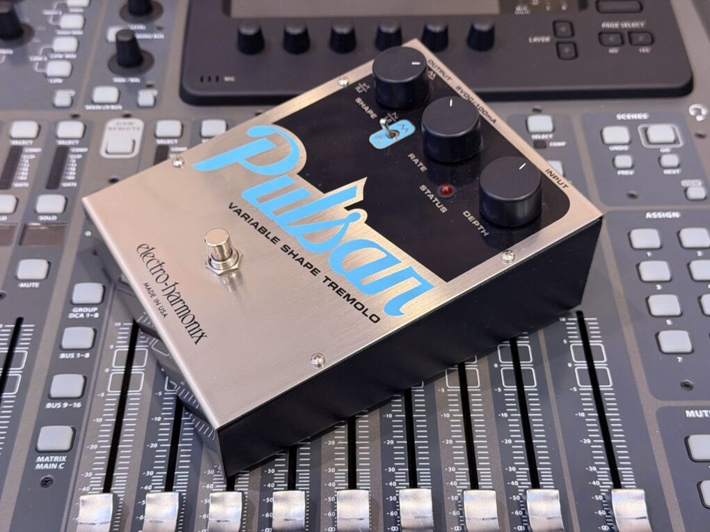 The Electro-Harmonix a versatile, analog, variable-shape tremolo pedal, capable of producing anything from smooth vintage surf to sharp, choppy, or rhythmic, modulated sounds in both mono and stereo. It features a shape switch for triangle/square waves and a shape knob that alters the modulation from rising/falling saws to pulse width.