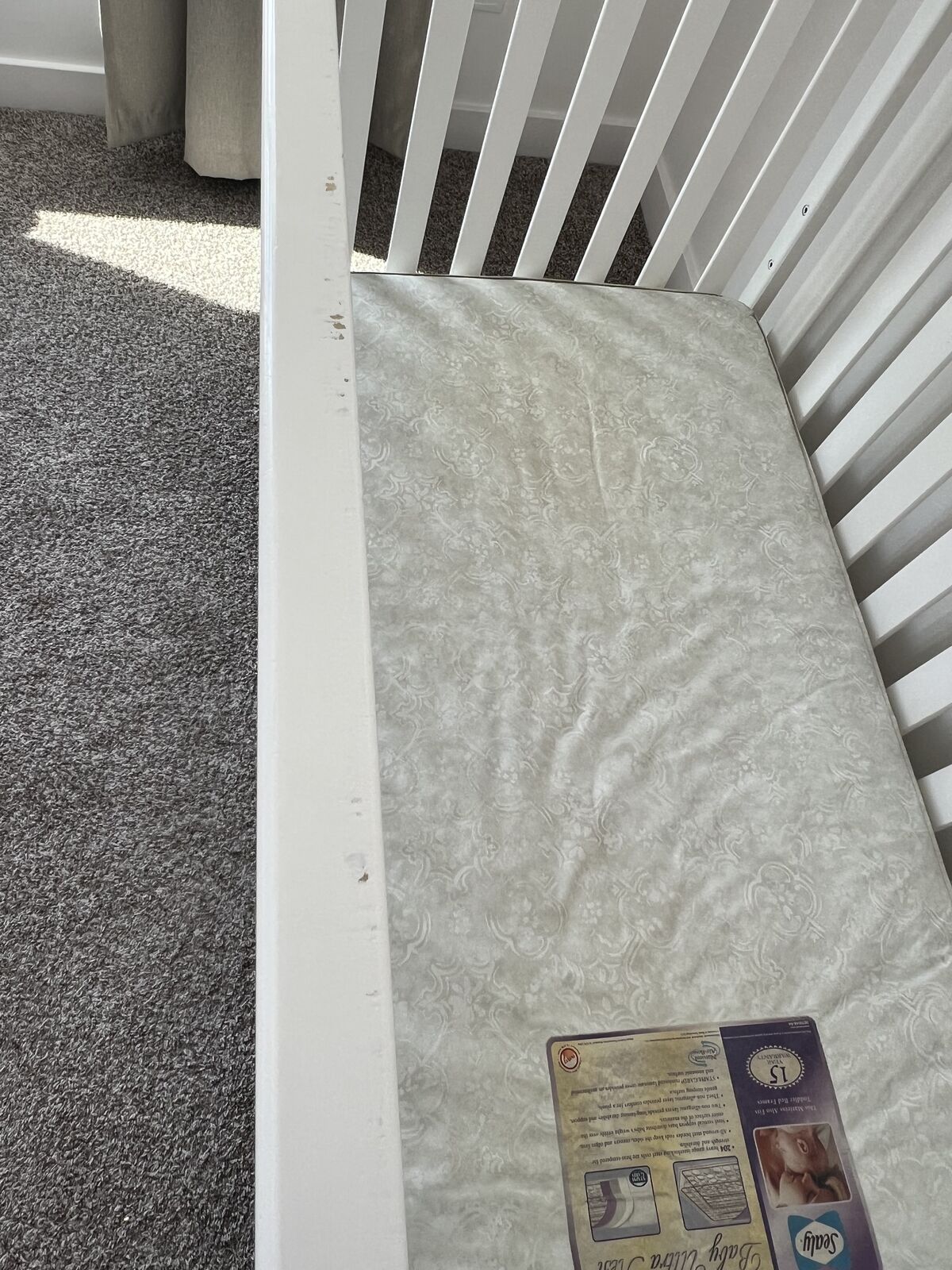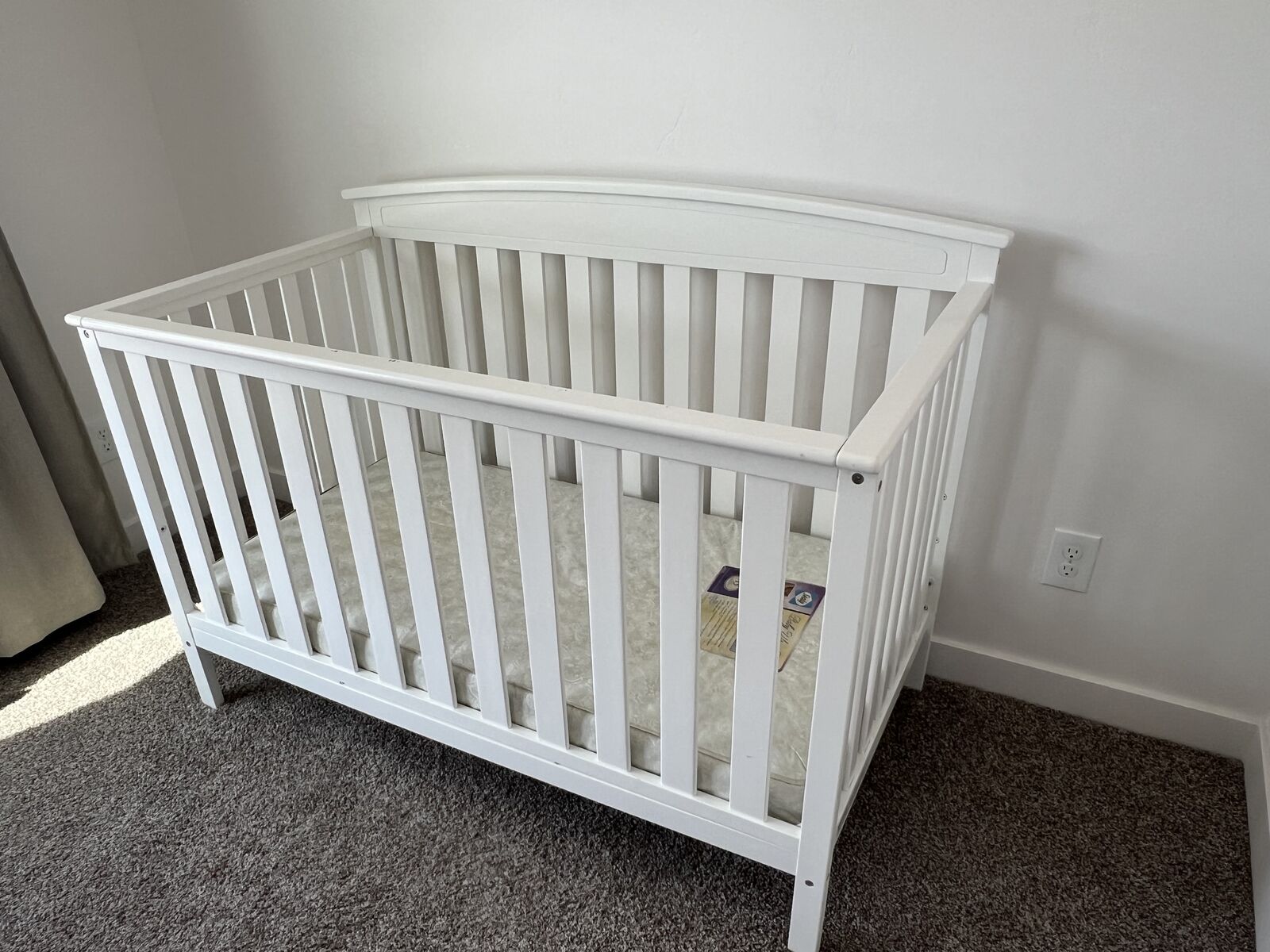 VenmoWhite baby crib with mattress. In fair condition. It has some scratches and chipped paint. The mattress can set to three different heights. It's currently disassembled and ready to be moved.