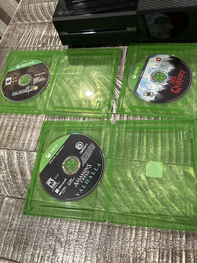 VenmoTested and working Xbox one bundle games and controller. Xbox one has been taken apart cleaned out thermal paste replaced and the disc drive rollers have been cleaned. It has been tested with Mortal Kombat 11 and works just fine ready for a new account to be added. Connects to the Internet not banned no issues 500 GB hard drive. included our the following games call of duty infinite warfare, far cry primal , assassin’s Creed syndicate assassins Creed origins, assassin Creed the Esso collection Mortal Kombat 11 ,disc only copies are as is, The quarry ,Final Fantasy type zero HD ,assassin‘s Creed Valhalla. Included is an advanced warfare, special edition controller. The thumb sticks aren’t the best and the B button is sticking, but does not affect gameplay. All the games have been tested and working on the system itself to verify they are working. I’m asking 180 or best offer at willing to trade for higher value items. pick up in West Jordan Utah cash is best but willing to do Venmo. The disc drive is a little slow on reading games.